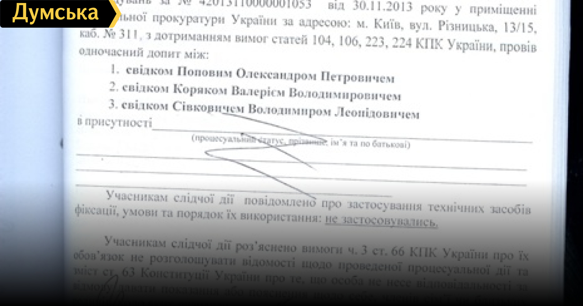 Киевское издание «Главком» опубликовало часть протоколов допросов бывшего главы Киевской городской администрации Александра Попова, зам секретаря СНБО Владимира Сивковича, а также начальника Киевской милиции Владимира Коряка. Доказать аутентичность сканов мы не можем, но вероятность их подлинности высока.