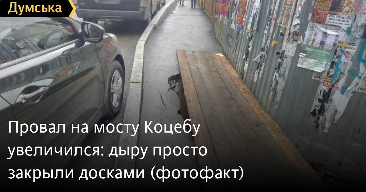 Провал на недавно отремонтированном мосту Коцебу заметно увеличился и занял почти всю ширину тротуара.