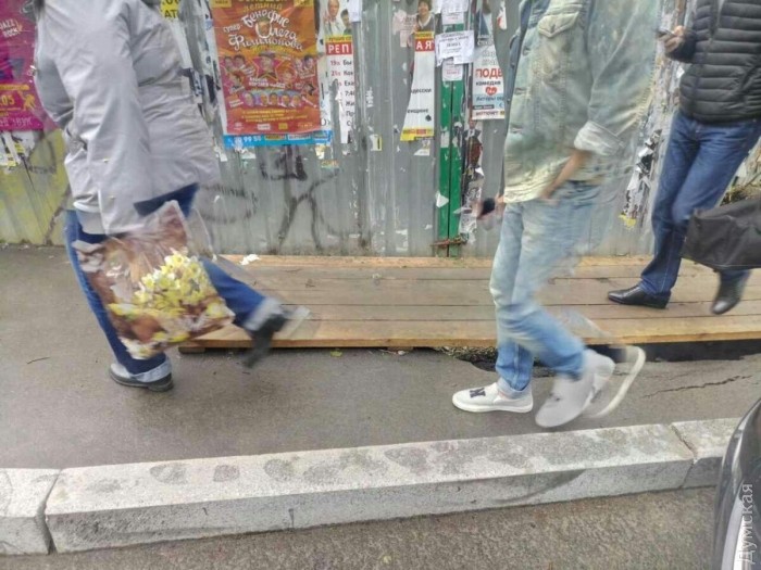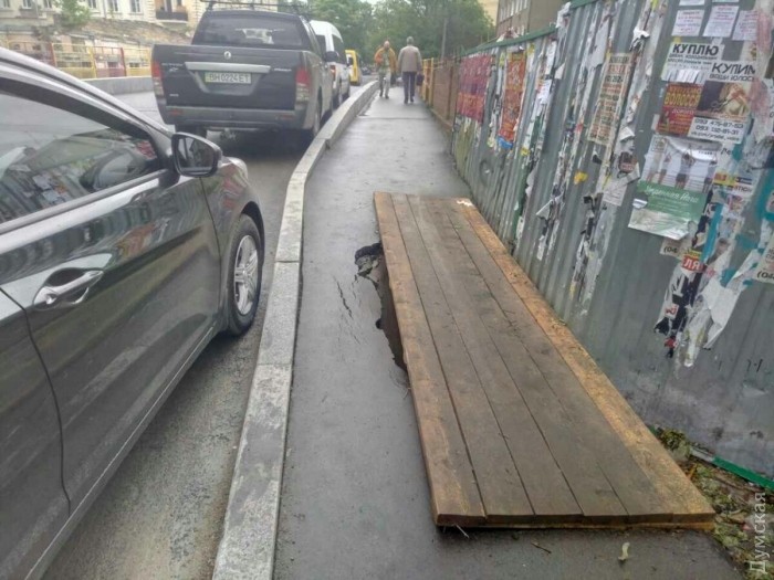 В конце марта яму засыпали щебнем, который теперь просел. Сверху разрастающийся провал закрыт обычными досками, на которые решаются наступить далеко не все пешеходы.