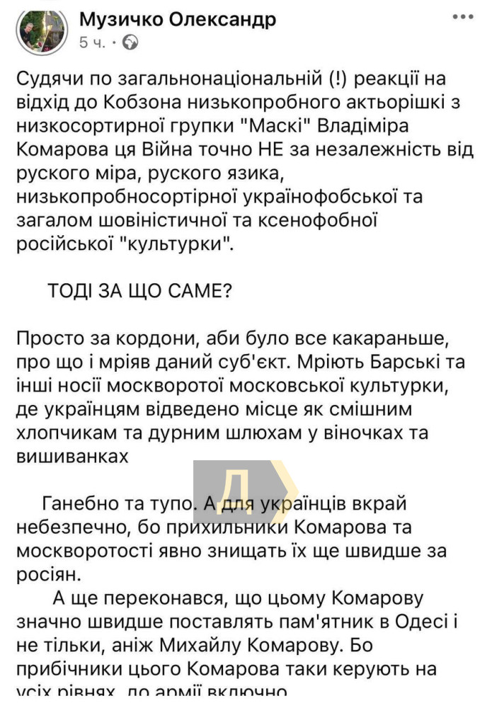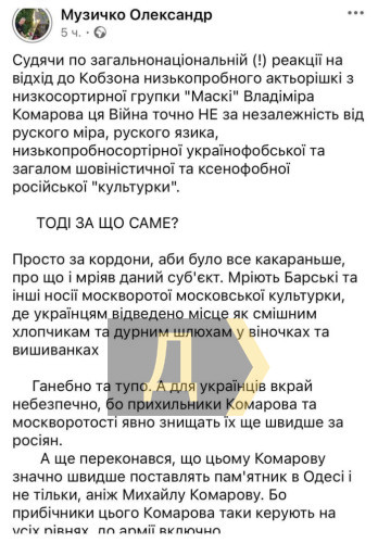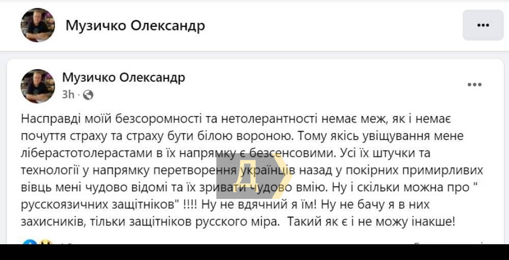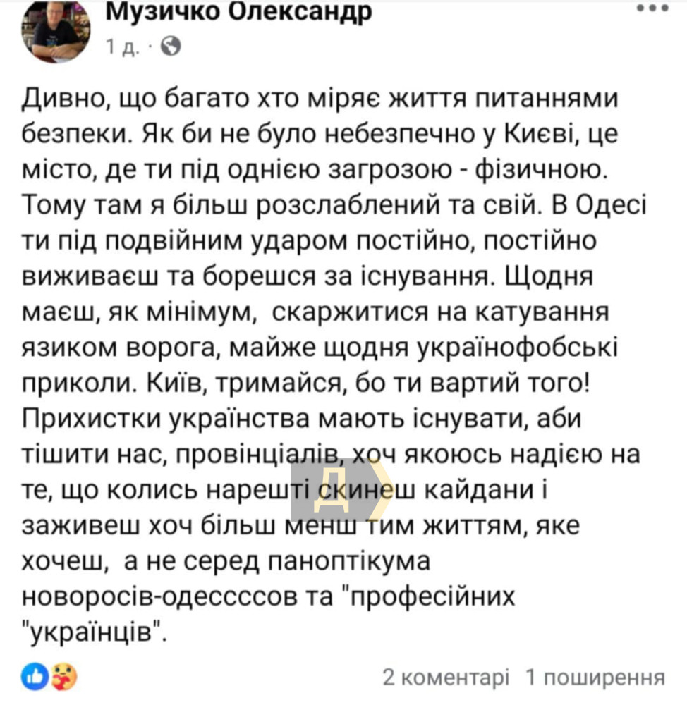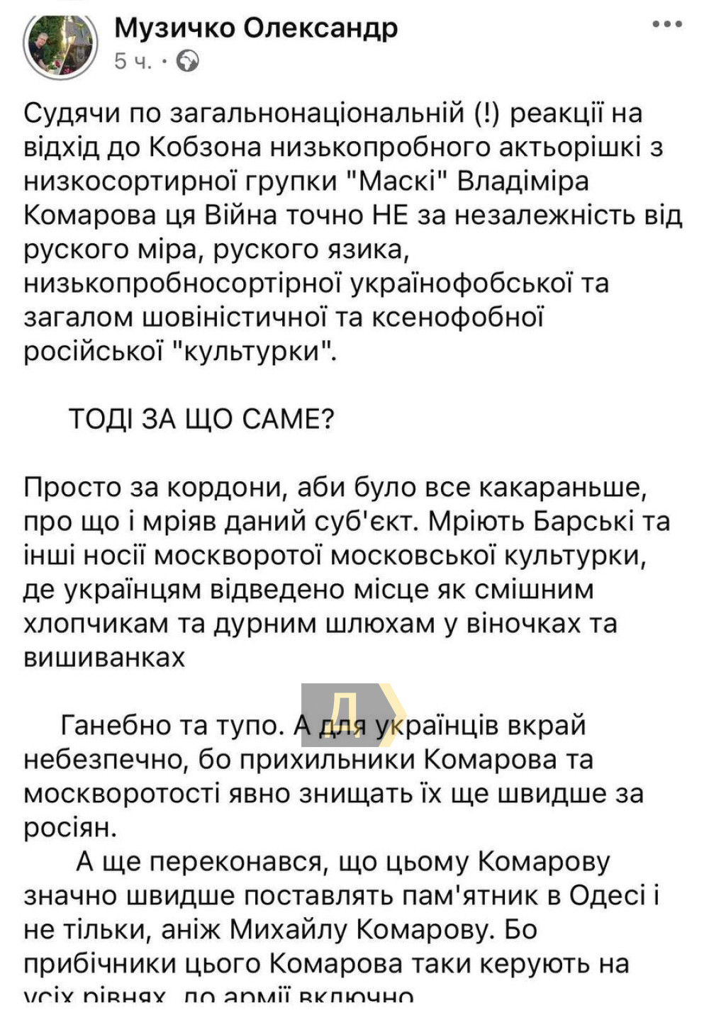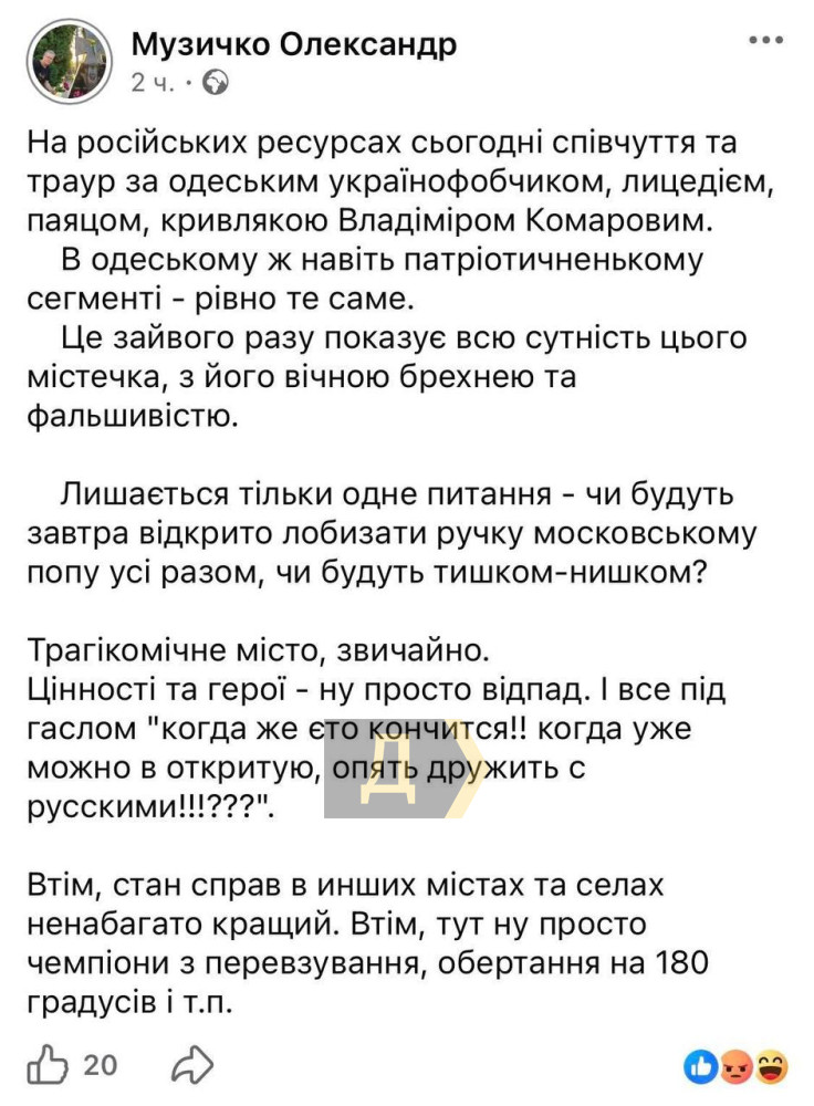 Взялись за профессора-антисемита? Одесский университет Мечникова начал служебную проверкуСлужебное расследование в отношении Александра Музычко, известного своими антисемитскими и в целом маргинальными высказываниями, начали в Одесском университете Мечникова. Как сообщили в вузе, причиной разбирательства стали многочисленные обращения по поводу систематических публичных выступлений преподавателя. Мы поинтересовались, отстранят ли профессора от преподавания на время расследования, однако ответа не поучили. Последней каплей стал пост Музычко, где тот нелестно отзывается о Владимире Комарове, который умер всего несколько дней назад. Публикация вызвала волну возмущения, в адрес Университета буквально посыпались обращения с требованием дать оценку действиям Музычко. Одним из авторов стал депутат Одесского облсовета Февзи Мамутов. «Владимир Комаров огромному количеству одесситов был другом, таким светлым пятном в жизни многих людей. Его сын служит в Вооруженных силах. Что касается Музычко, маргинализация его личности происходила практически на глазах у всей Одессы. Он работает в университете, соприкасается с молодежью, формирует вообще мировоззрение. Для меня важно, как университет, в свою очередь, отреагирует. Посмотреть результаты служебного расследования. Дальше уже есть департамент образования, есть Министерство образования и науки, в крайнем случае», — поясняет Мамутов. После скандала Музычко закрыл свой аккаунт в Facebook. Это далеко не первый такой его пост. Он с завидным постоянством подтирает их, однако, скрины остаются. Чаще всего, он оскорбляет русскоязычных военных, сам не опасаясь ТЦК благодаря брони преподавателя. Некоторые его посты вызывают откровенное удивление. Например, восхищение диктатором Аугусто Пиночетом. Мы пообщались с несколькими коллегами Музычко, и услышали от них исключительно негативные отзывы. Все наши собеседники пожелали остаться анонимными источникми. Профессора характеризуют как склочного, не смелого и очень падкого на деньги человека. В частности на нем якобы было завязано несколько правительственных грантов. Один из них лоббировал бывший руководитель Офиса президента Андрей Ермак, который делал политическую ставку на тех, кто будет работать с этими деньгами. Именно поэтому, мол, администрация вуза не спешит попрощаться с Музычко. Впрочем, уволить преподаватель — задача со звездочкой. Порой администрация и рада бы избавиться от «кадра», да не может. И тут показательным станет это лето — когда у Музычко закончится контракт, и уже новому ректору решать, продлевать или нет. Еще одна интересная деталь, называя себя «настоящим украинским националистом», ругая на чем свет стоит, «москворотых» попов, Музычко был участником конференции, организованной этими самым попами. Мероприятие называлось «Киево-Печерская Лавра – Афон – Иерусалим: единство сквозь века» и проходило в Киеве в 2018, на четвертый год войны на востоке Украины. Об участии Музычко в этом мероприятии еще год назад писал эксперт по международной политике, а сегодня военнослужащий, Артем Филиппенко. «Хочу заметить, во дворе июль 2018 года. В апреле 2018 г. иерархи УПЦ КП и УАПЦ подписали обращение к Вселенскому Патриарху о предоставлении Томоса об автокефалии. РПЦ в лице УПЦ МП, конечно, против. Но «настоящий украинский на