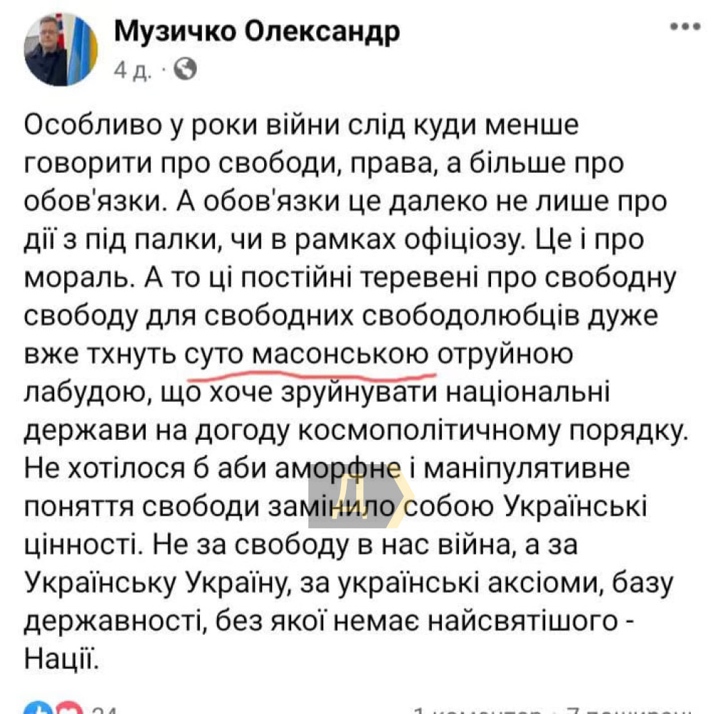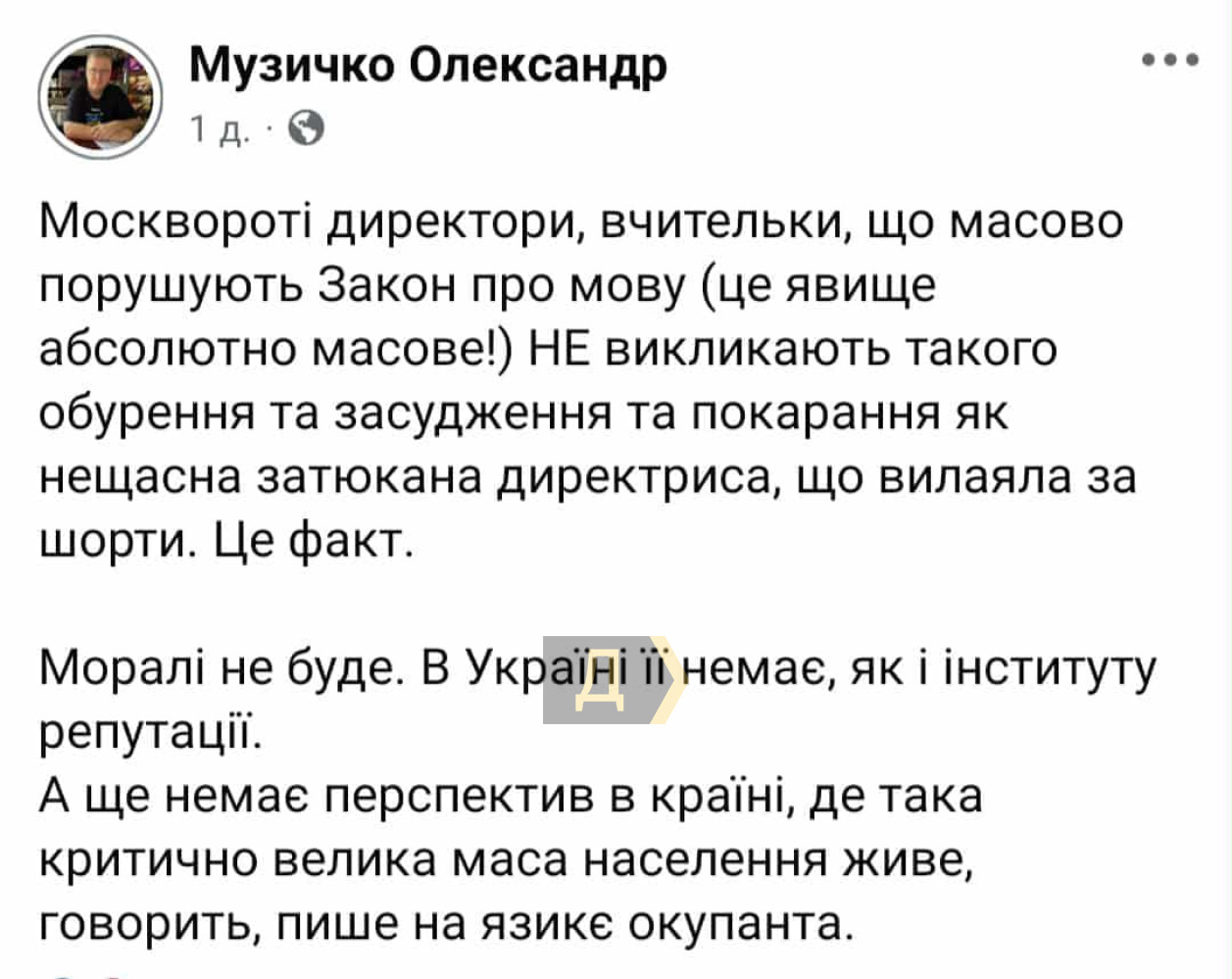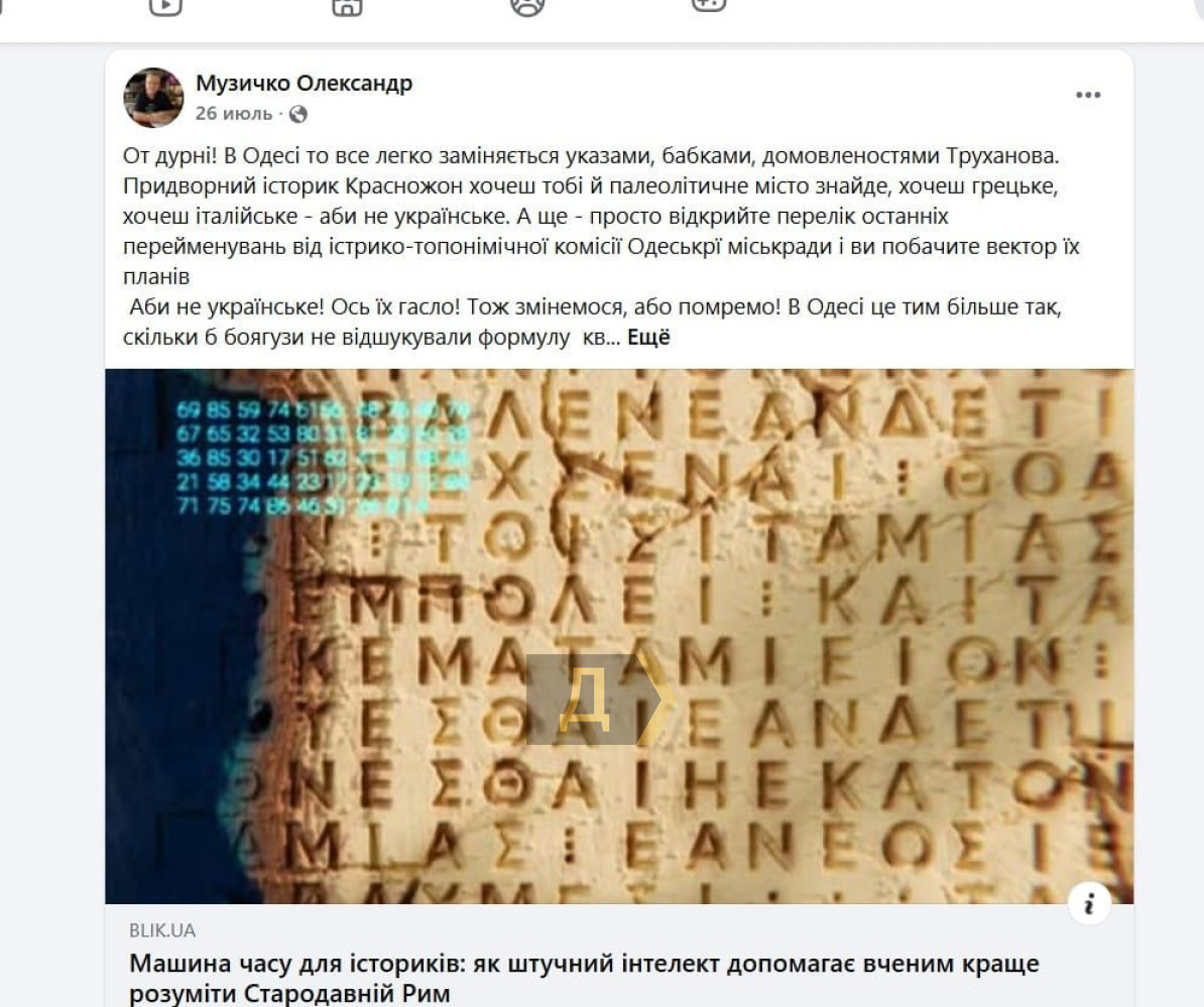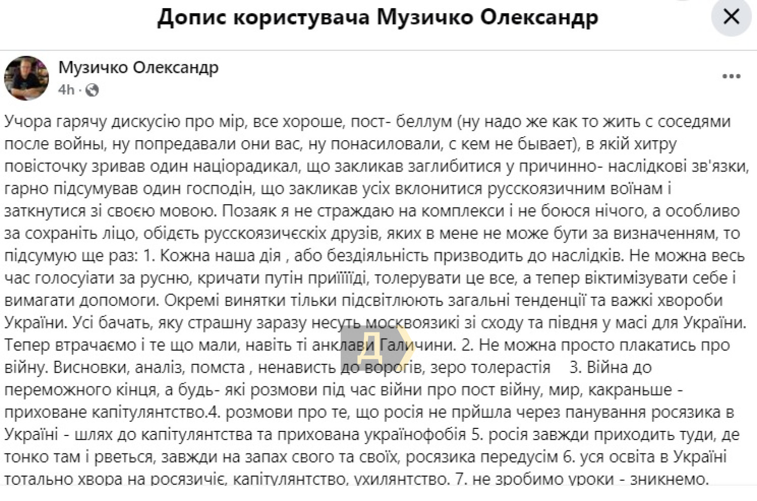 Взялись за профессора-антисемита? Одесский университет Мечникова начал служебную проверкуСлужебное расследование в отношении Александра Музычко, известного своими антисемитскими и в целом маргинальными высказываниями, начали в Одесском университете Мечникова. Как сообщили в вузе, причиной разбирательства стали многочисленные обращения по поводу систематических публичных выступлений преподавателя. Мы поинтересовались, отстранят ли профессора от преподавания на время расследования, однако ответа не поучили. Последней каплей стал пост Музычко, где тот нелестно отзывается о Владимире Комарове, который умер всего несколько дней назад. Публикация вызвала волну возмущения, в адрес Университета буквально посыпались обращения с требованием дать оценку действиям Музычко. Одним из авторов стал депутат Одесского облсовета Февзи Мамутов. «Владимир Комаров огромному количеству одесситов был другом, таким светлым пятном в жизни многих людей. Его сын служит в Вооруженных силах. Что касается Музычко, маргинализация его личности происходила практически на глазах у всей Одессы. Он работает в университете, соприкасается с молодежью, формирует вообще мировоззрение. Для меня важно, как университет, в свою очередь, отреагирует. Посмотреть результаты служебного расследования. Дальше уже есть департамент образования, есть Министерство образования и науки, в крайнем случае», — поясняет Мамутов. После скандала Музычко закрыл свой аккаунт в Facebook. Это далеко не первый такой его пост. Он с завидным постоянством подтирает их, однако, скрины остаются. Чаще всего, он оскорбляет русскоязычных военных, сам не опасаясь ТЦК благодаря брони преподавателя. Некоторые его посты вызывают откровенное удивление. Например, восхищение диктатором Аугусто Пиночетом. Мы пообщались с несколькими коллегами Музычко, и услышали от них исключительно негативные отзывы. Все наши собеседники пожелали остаться анонимными источникми. Профессора характеризуют как склочного, не смелого и очень падкого на деньги человека. В частности на нем якобы было завязано несколько правительственных грантов. Один из них лоббировал бывший руководитель Офиса президента Андрей Ермак, который делал политическую ставку на тех, кто будет работать с этими деньгами. Именно поэтому, мол, администрация вуза не спешит попрощаться с Музычко. Впрочем, уволить преподаватель — задача со звездочкой. Порой администрация и рада бы избавиться от «кадра», да не может. И тут показательным станет это лето — когда у Музычко закончится контракт, и уже новому ректору решать, продлевать или нет. Еще одна интересная деталь, называя себя «настоящим украинским националистом», ругая на чем свет стоит, «москворотых» попов, Музычко был участником конференции, организованной этими самым попами. Мероприятие называлось «Киево-Печерская Лавра – Афон – Иерусалим: единство сквозь века» и проходило в Киеве в 2018, на четвертый год войны на востоке Украины. Об участии Музычко в этом мероприятии еще год назад писал эксперт по международной политике, а сегодня военнослужащий, Артем Филиппенко. «Хочу заметить, во дворе июль 2018 года. В апреле 2018 г. иерархи УПЦ КП и УАПЦ подписали обращение к Вселенскому Патриарху о предоставлении Томоса об автокефалии. РПЦ в лице УПЦ МП, конечно, против. Но «настоящий украинский на