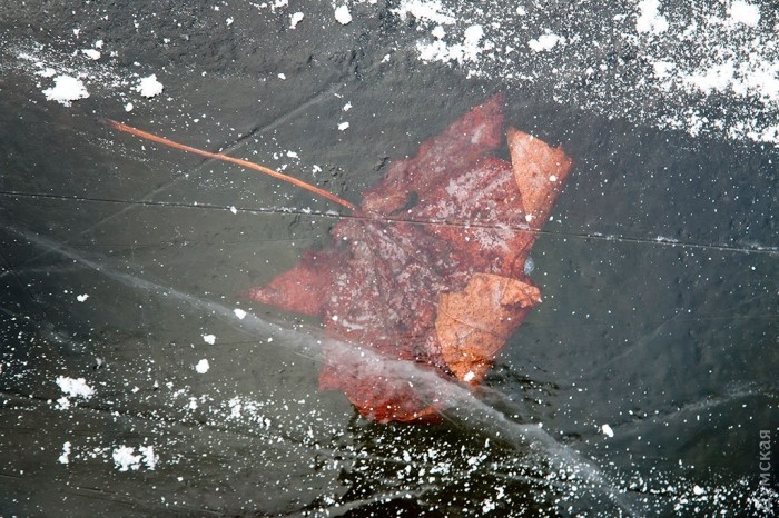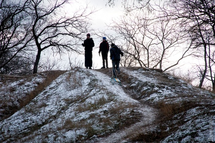 Не повезло любителям саней. На окружающих пруды горках почти нет снега, и им приходится скользить по замерзшей глине.