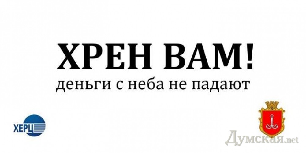 Псевдомэр Одессы ответил на рекламу ГЕРЦа: «Деньги с неба не падают» (фотофакт)На «фейковую» страницу мэра Одессы в «Фейсбуке» выложили своеобразный ответ на появившуюся недавно социальную рекламу ГЕРЦа, призывающую горожан исправно оплачивать коммунальные услуги. На ГЕРЦовское «Заплати» неизвестные шутники отвечают по-старорусски «Хрен вам!» СМЕРТЬ РОСІЙСЬКИМ ОКУПАНТАМ! Помітили помилку? Виділяйте слова з помилкою та натискайте control-enter |