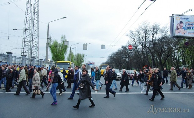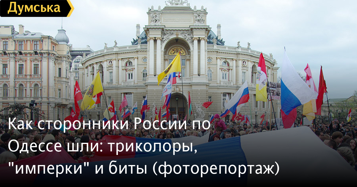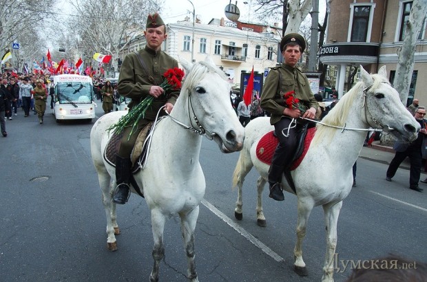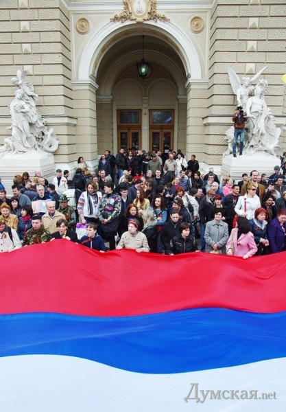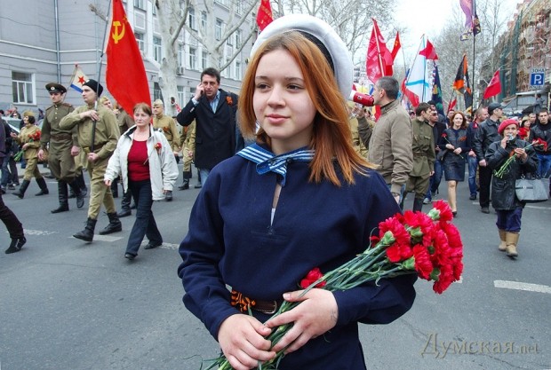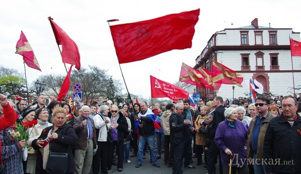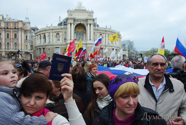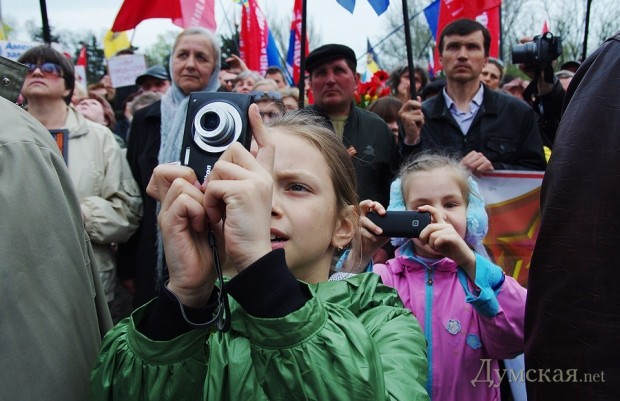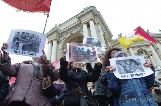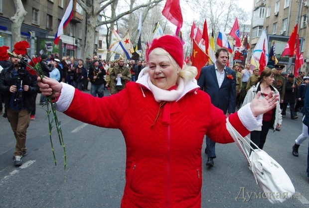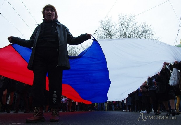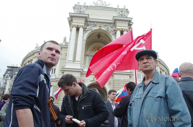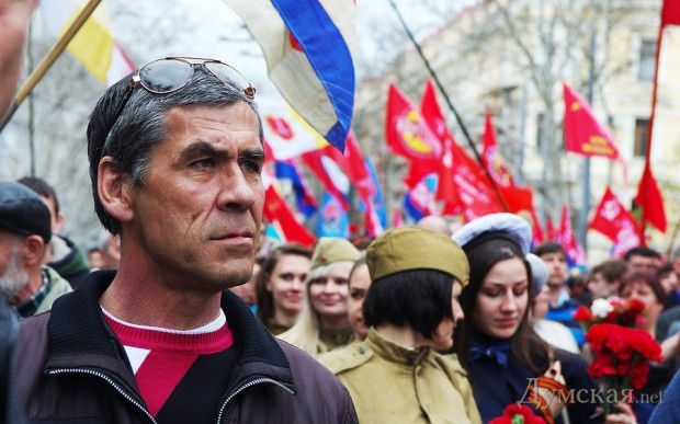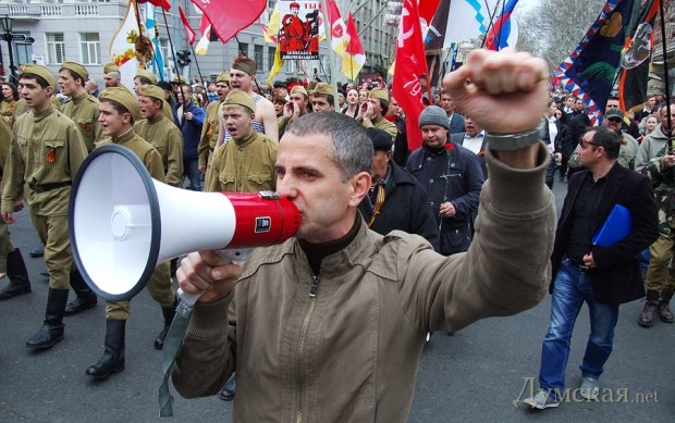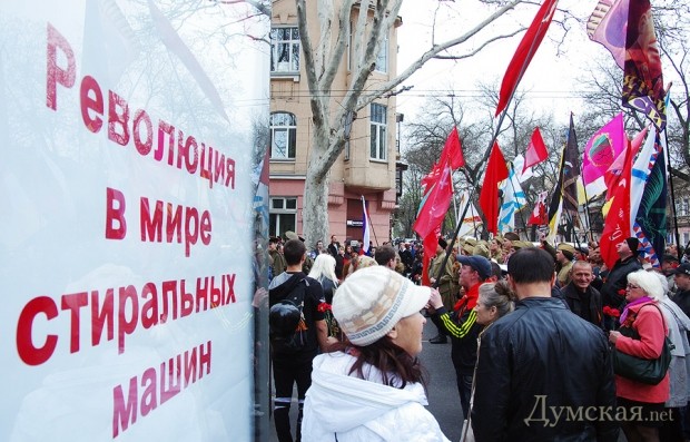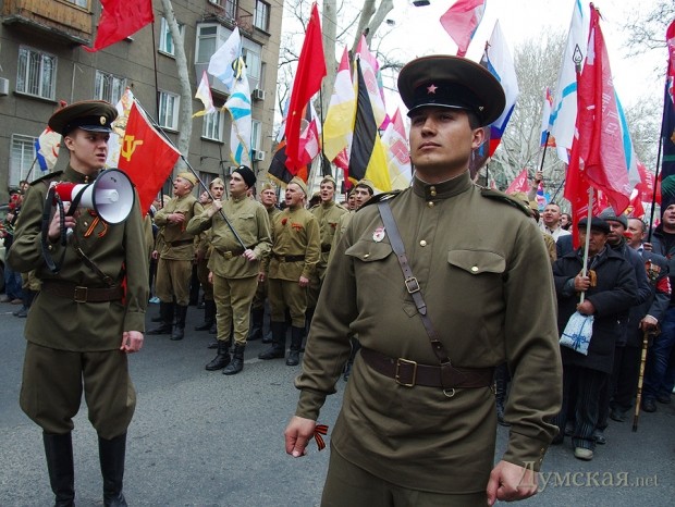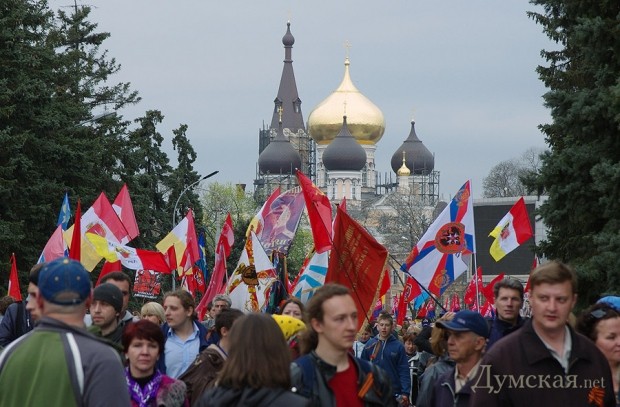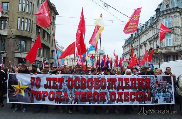 Сторонники России, нарушив (как и их оппоненты) все договоренности, устроили сегодня, в День Освобождения, очередную сепаратистско-ирредентистскую акцию. Несколько тысяч любителей Путина прошлись от Оперного к Куликовому полю, выкрикивая свои любимые лозунги — «Россия, Россия», «Один за всех — и все за одного», «Беркут» и «Гони Бандеру в шею».