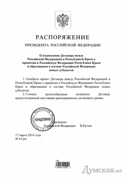 Кроме того, Путин распорядился одобрить проект договора между РФ и Крымом о присоединении последнего к Федерации.