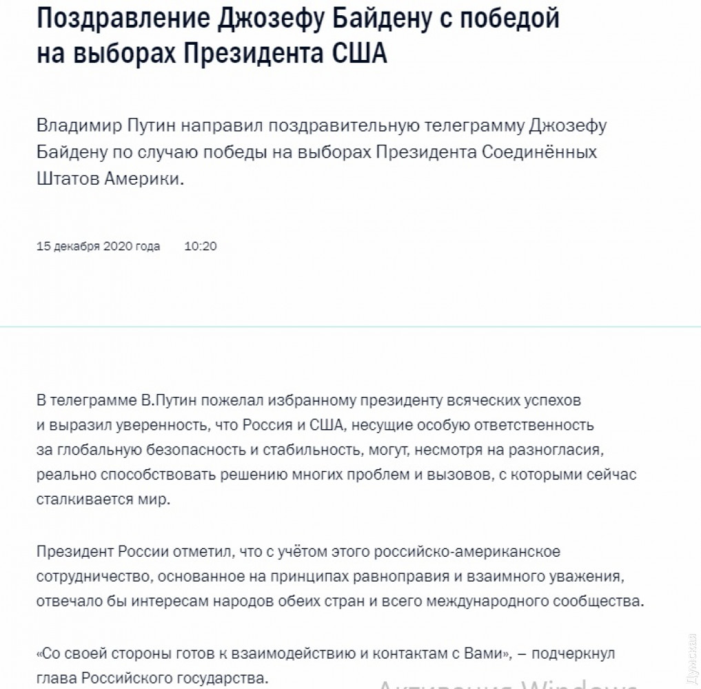 Президент России Владимир Путин только сейчас поздравил избранного президента США Джо Байдена с победой на выборах. До этого в Кремле не спешили с поздравлениями — говорили, что нужно дождаться официального объявления итогов. Путин направил Байдену поздравительную телеграмму, в которой пожелал президенту США всяческих успехов. «Со своей стороны готов к взаимодействию и контактам с Вами», – цитируют Путина в Кремле. Напомним, коллегия выборщиков США подтвердила победу Байдена на выборах — он получил 306 голосов выборщиков из необходимых 270. Результаты выборов президента Конгресс США должен утвердить 6 января. СМЕРТЬ РОССИЙСКИМ ОККУПАНТАМ! Заметили ошибку? Выделяйте слова с ошибкой и нажимайте control-enter |