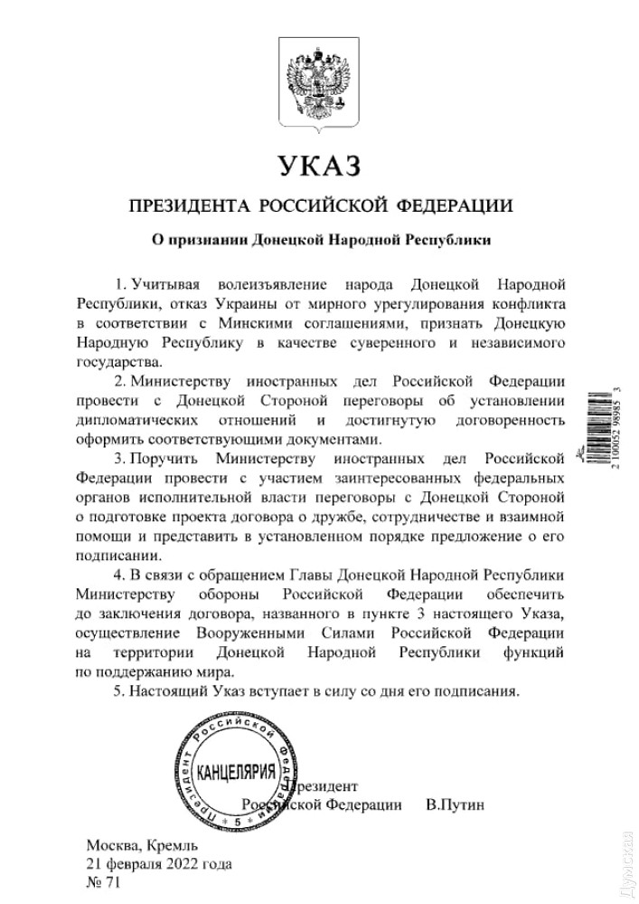 ОБНОВЛЕНО В 23:19. На сайте Кремля опубликовали указы Путина о признании псевдореспублик. Таким образом они вступили в силу.
