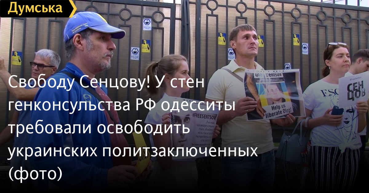 Люди держали в руках плакаты с хештегом FreeSentsov. Наклейки с такой же надписью участники акции наклеили на стены консульства.