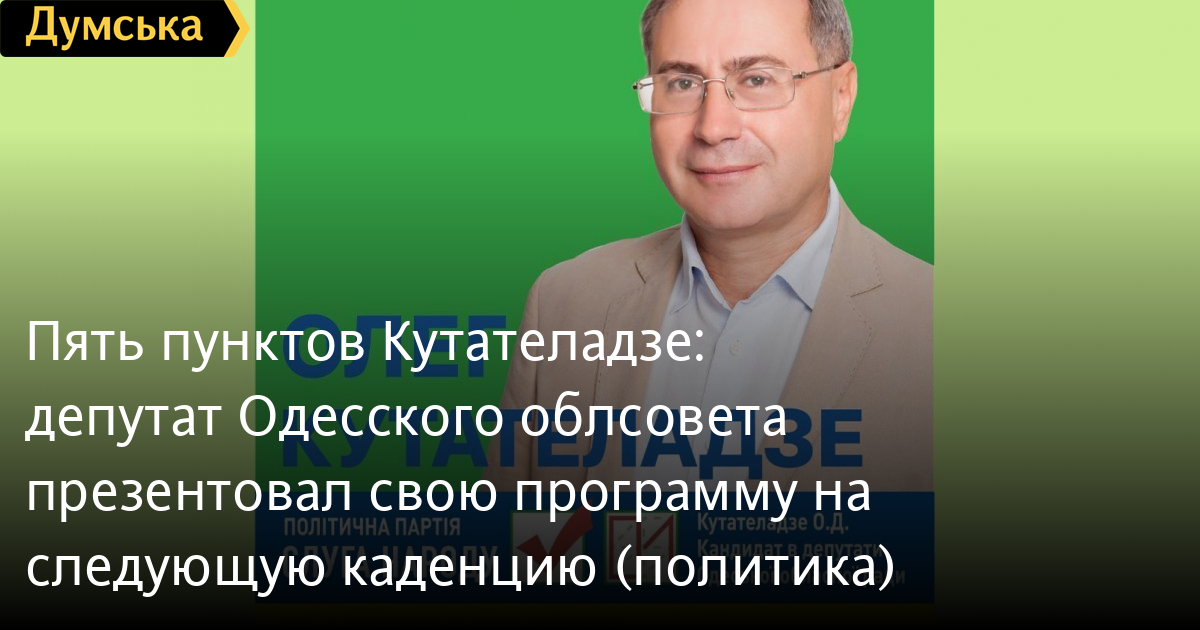 Пять пунктов Кутателадзе: депутат Одесского облсовета презентовал свою программу на следующую каденцию (политика)Депутат Одесского областного совета и кандидат в депутаты от партии «Слуга народа» Олег Кутателадзе представил свою программу. Программа состоит из пяти главных пунктов: «1. Качественная инфраструктура — фундамент развития общества. Современная громада должна быть обеспечена предоставлением качественных услуг, необходимых для комфортной жизни жителей: вода, отопление, газ и электроэнергия. Вновь созданные громады пытаются поддерживать существующие коммуникации в рабочем состоянии. Работая в Одесском областном совете, мы с вами реализуем проекты софинансирования строительства обновленных коммуникаций в варианте «громада — область — государство». Развитие коммунальной сферы даст значительный толчок к привлечению инвестиционных проектов, обеспечит громады новыми рабочими местами и поступлениями средств в бюджет. 2. Безопасная громада — комфортная громада. Вопрос безопасности — один из главных в жизнедеятельности любого населенного пункта. Каждый гражданин должен чувствовать себя безопасно на улицах своего города и у себя дома. Мы будем уверены в безопасности наших детей, когда они передвигаются по улицам населенного пункта, не будем переживать за близких, которые поздно возвращаются домой с работы по освещенным улицам, с комфортными пешеходными зонами. Все это возможно реализовать путем привлечения средств инвесторов и бюджетных средств, при участии областного совета и Верховной Рады. 3. Образование — будущее успешной страны. Образование — одна из фундаментальных потребностей общества, которая гарантирует развитие человека и громады. Современные методы воспитания и обучения станут залогом развития каждого населенного пункта. Дети будут учиться в современных школах в комфортных условиях. Воспитатели и учителя — люди, которые посвятили свою жизнь нашим детям. Сотрудничая с органами местного самоуправления, мы будем искать возможности улучшения условий их труда и повышения их уровня жизни педагогов. 4. Транспортное сообщение — возможности развития громады. Каждый гражданин на себе лично чувствует улучшение качества автодорог государственного значения. Важным остается вопрос состояния асфальтового покрытия в самих населенных пунктах и подъездные пути от сел и поселков к большим магистралям. Решение этой проблемы заключается в проектах софинансирования с бюджетами разных уровней. Мы будем привлекать внимание органов власти на всех уровнях для поиска средств на развитие качественной транспортной инфраструктуры. Дороги — старт для развития сети сообщения между населенными пунктами общественным транспортом. Улучшение асфальтового покрытия позволит обеспечить автобусное сообщении так, как того требуют сами жители (увеличение количества рейсов и остановок транспорта, новые маршруты). 5. Экология — здоровье украинцев. Сохранение и восстановление экологии очень важно для будущего каждого украинца. Мы — то, чем мы дышим, что пьем и едим. Каждый должен иметь возможность оздоровиться на территории наших природных здравниц. Уже сделано немало для спасения и восстановления Куяльницкого и Тилигульского лиманов». Кутателадзе отмечает, что лично выделил 300 тыс. грн из собственных средств 
