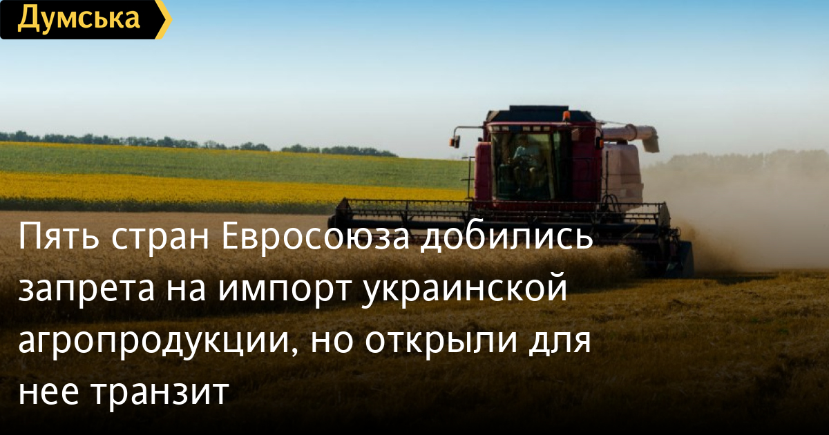 П`ять країн Євросоюзу домоглися заборони на імпорт української агропродукції, але відкрили для неї транзитЄврокомісія з 2 травня ввела заборону на імпорт українських пшениці, кукурудзи, ріпаку та насіння соняшнику в Польщу, Румунію, Словаччину, Болгарію та Угорщину. У відомстві повідомили, що обмеження діятимуть до 2 червня і введені на вимогу країн, оскільки потік дешевої української агропродукції, що хлинув, обвалив у них ціни. Раніше п'ять держав самостійно запроваджували обмеження, які стосувалися і транзиту українського продовольства. Тепер транзит через сусідні країни не заборонений. Українські аграрії зможуть везти свій урожай у будь-які країни Євросоюзу, крім цих п'яти. ЄС також гарантував фінансову підтримку місцевих фермерів, чий бізнес похитнувся через прихід української агропродукції на ринок. Помітили помилку? Виділяйте слова з помилкою та натискайте control-enter |