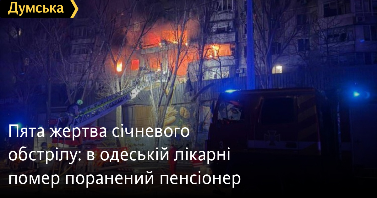 П’ята жертва січневого обстрілу: в одеській лікарні помер поранений пенсіонерКількість загиблих внаслідок ворожого обстрілу Одеси, що стався 27 січня, збільшилася до п'яти осіб. Про це повідомили у міській військовій адміністрації. Серце 77-річного чоловіка зупинилося у лікарні сьогодні вночі. Під час атаки він перебував у власній квартирі на вулиці Балківській, де отримав важкі опіки та отруєння продуктами горіння. Увесь цей час потерпілий перебував у реанімації опікового відділення у критичному стані. Медики вели боротьбу за його життя та робили все можливе, проте отримані травми виявилися несумісними з життям. Нагадаємо, того дня двоє загиблих, чоловік і жінка, були знайдені під завалами житлового будинку на Прохоровській, ще один чоловік — на Балківській. Всього в результаті атаки постраждали 35 осіб, у тому числі двоє дітей і вагітна. Ще один чоловік 1947 року народження помер в лікарні 29 січня. Пошкодження отримали майже 50 будинків, навчальні заклади і церква.