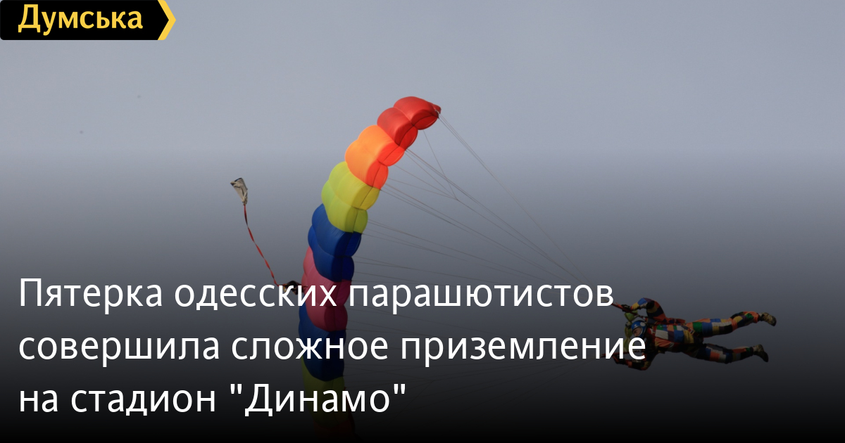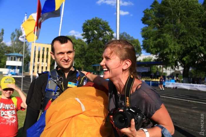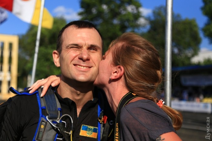 Последним летел парашютист с огромным украинским стягом. Его немного снесло ветром, и он чуть не вписался в размеры футбольного поля. Но к счастью, все обошлось. Через несколько минут промахнувшийся мимо цели парашютист получил аплодисменты зрителей и горячий поцелуй от возлюбленной.