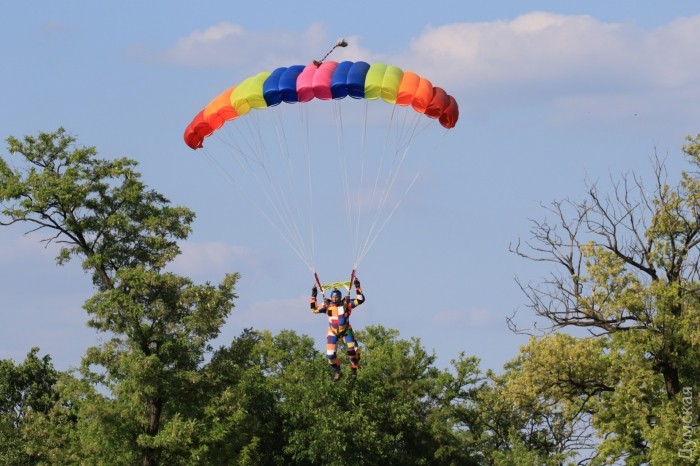 Ан-2 появился над стадионом на высоте 1200 метров в строго назначенное время. От него отделилось пять точек. Первым приземлился известный пилот Константин Оборин, который показал, как надо бороться с ветром.