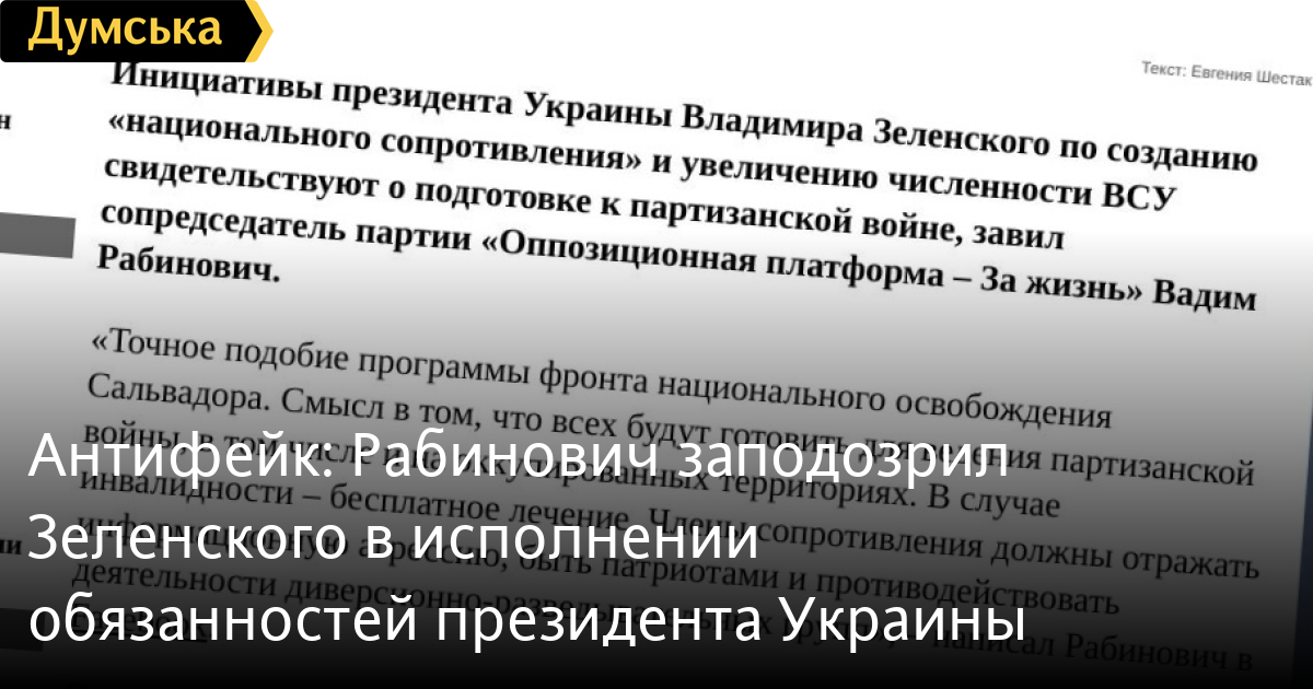 Придется огорчить народного избранника. На самом деле быть патриотами, отражать агрессию, в том числе информационную, обязаны не только «члены сопротивления», а все граждане Украины, в том числе сам Рабинович. Об этом прямым текстом сказано в статье 17-й Конституции Украины: защита суверенитета и территориальной целостности, обеспечение экономической и информационной безопасности Украины — это не только функция государства, но и дело всего украинского народа.