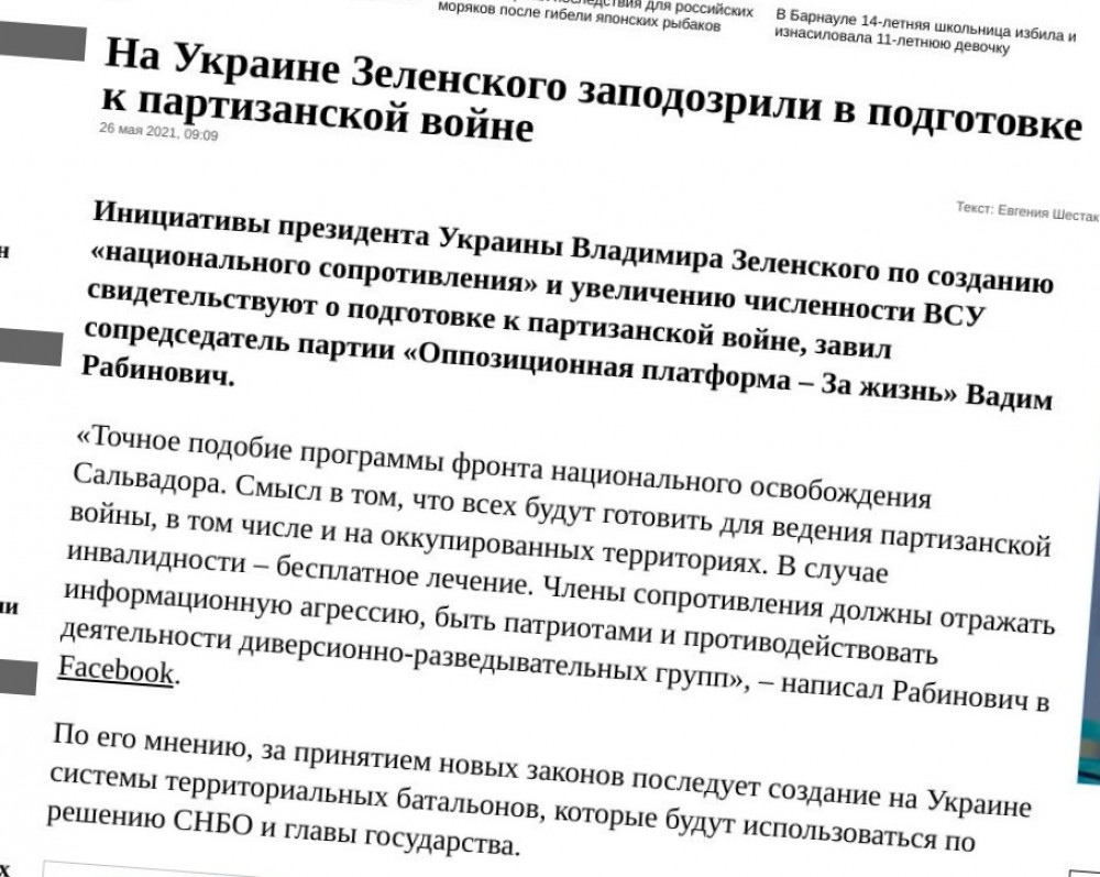 Российские и примкнувшие к ним СМИ запестрели сегодня жуткими заголовками:«Зеленский готовит украинцев к партизанской войне!», «На Украине планы Зеленского назвали подготовкой к партизанской войне!», «В Раде заявили о подготовке Зеленского к партизанской войне!» и даже: «Зеленский предложил громить противников Украины силами народного сопротивления».