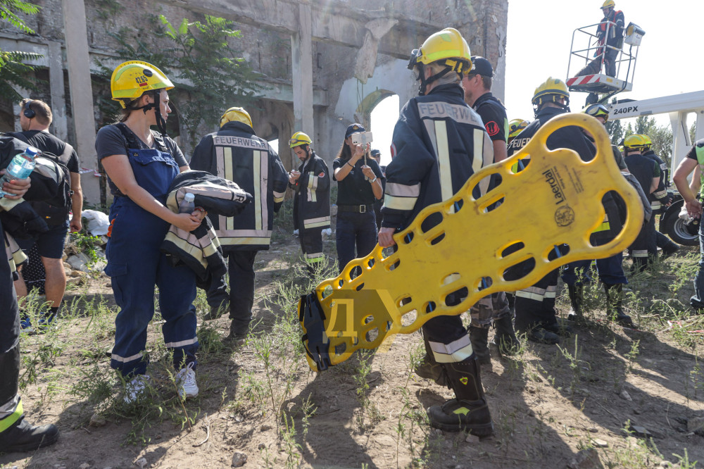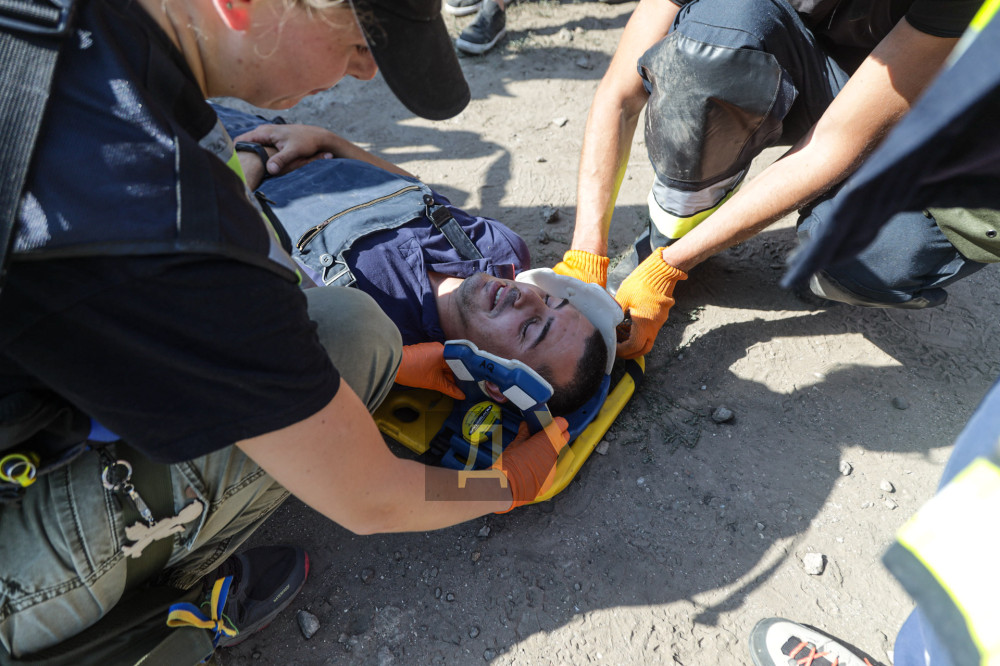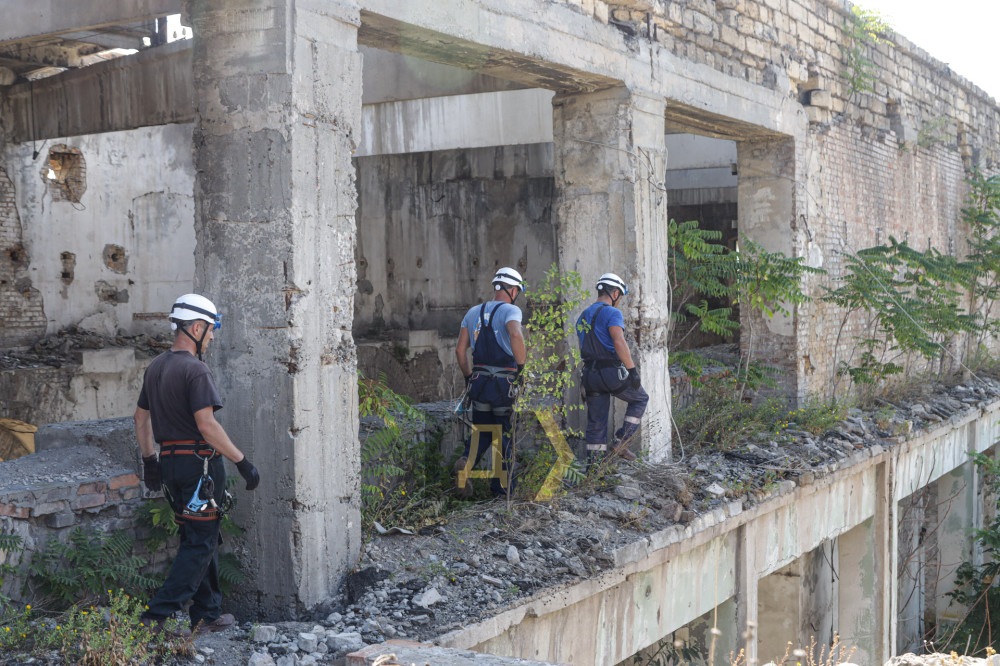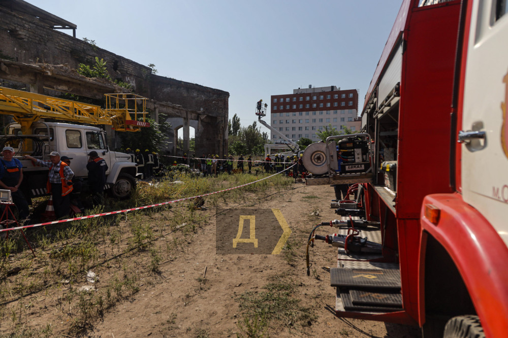 На побитому даху зруйнованого цеху роль постраждалого грає манекен. У нього перелом шиї та тяжка травма ноги. Манекен знерухомлюють на жорстких рятувальних ношах і спускають канатами вниз.