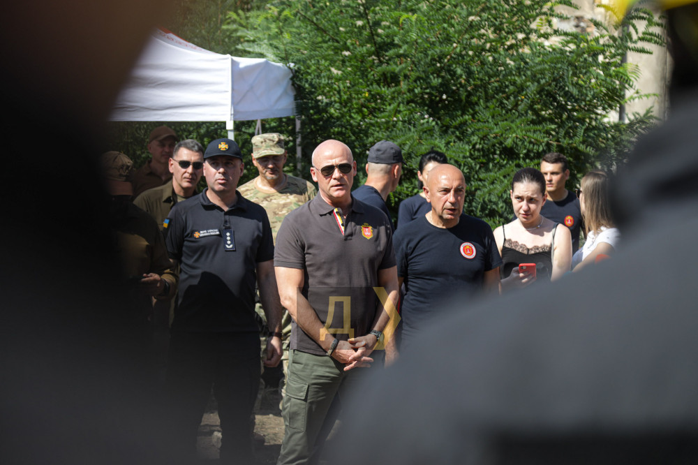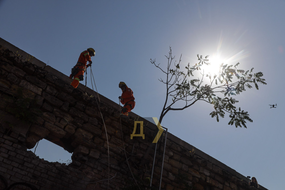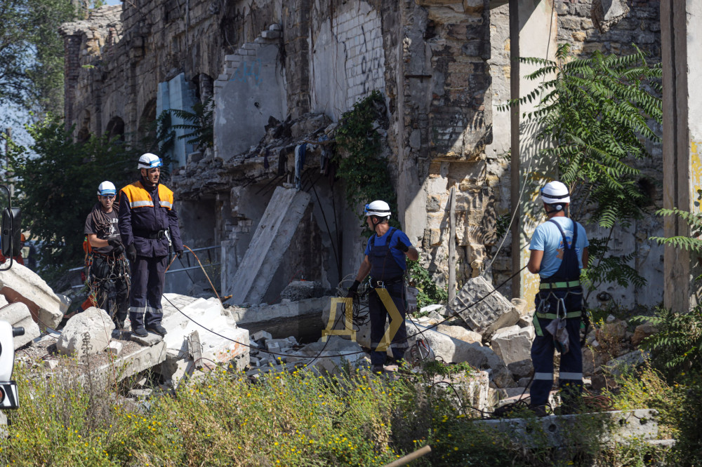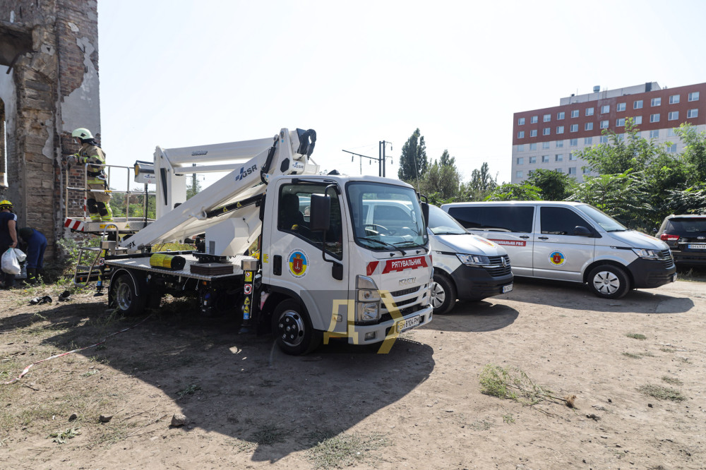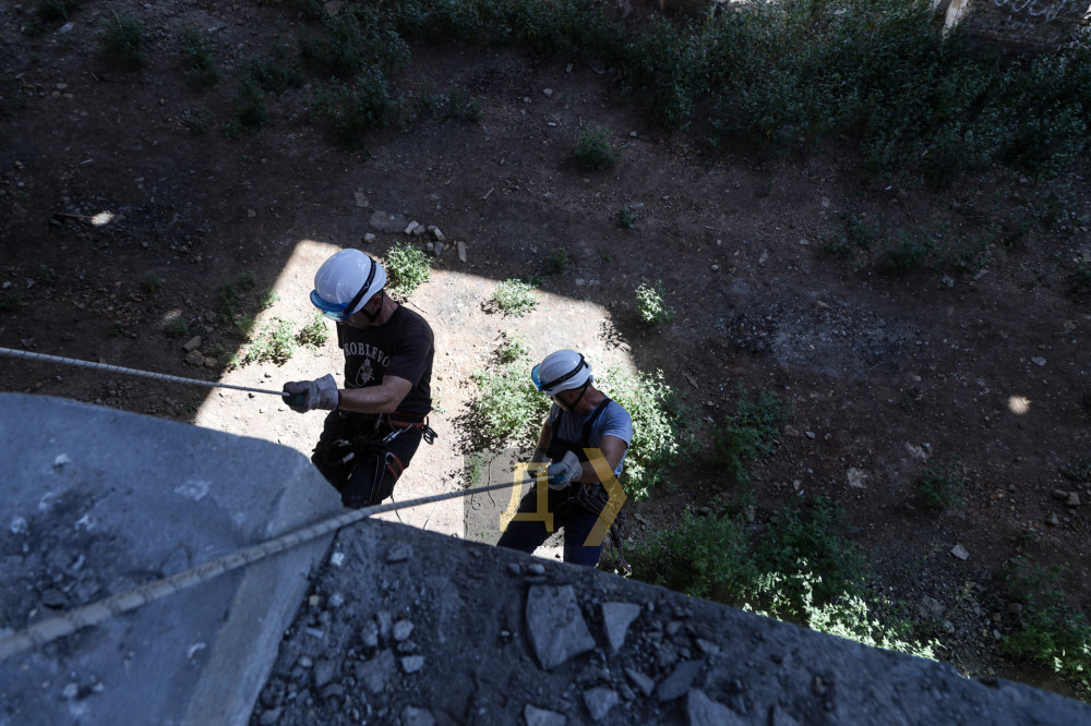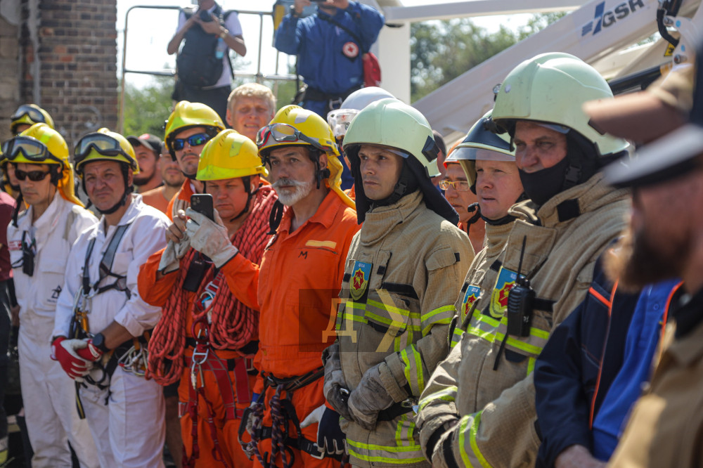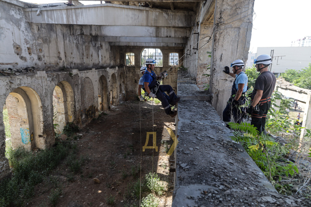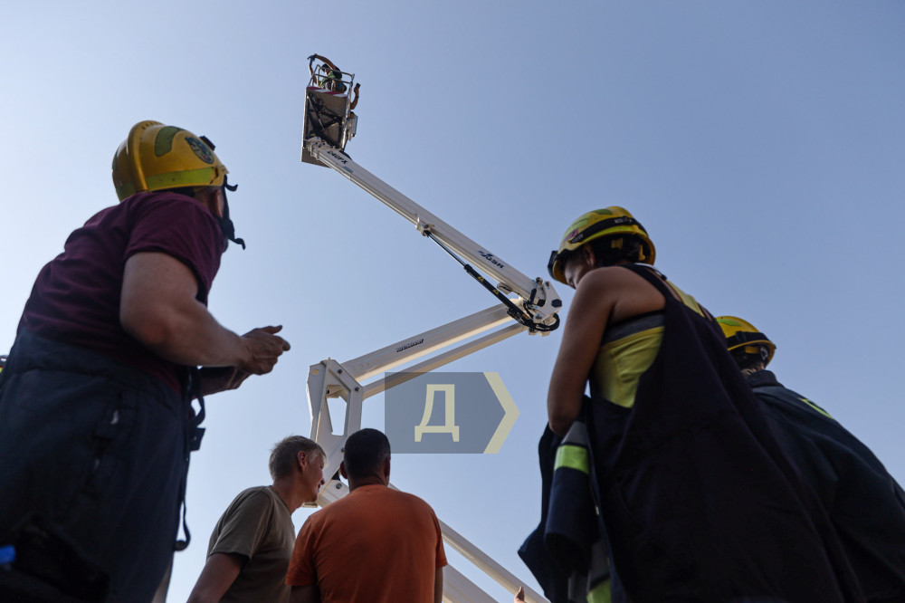 Після цього частина добровольців піднімається на вежах, щоб навчитися демонтувати небезпечні елементи, що звисають з фасаду будівлі. Для підйому використовуються як комунальні вишки, так і техніка, подарована Одесі європейськими містами-побратимами. Після виконання всіх завдань – групове фото.