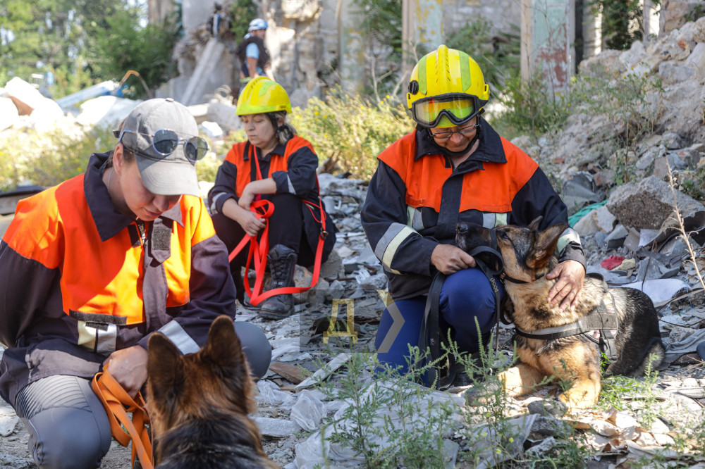 Першими на пошуки постраждалих висуваються інструктори-кінологи. Собаки обнюхують руїни, що димляться, і приводять рятувальну групу до уламків цегли, якими акуратно обклали «постраждалого».