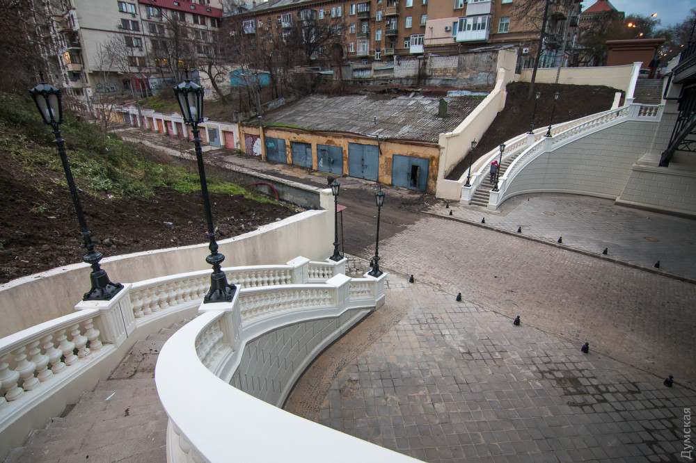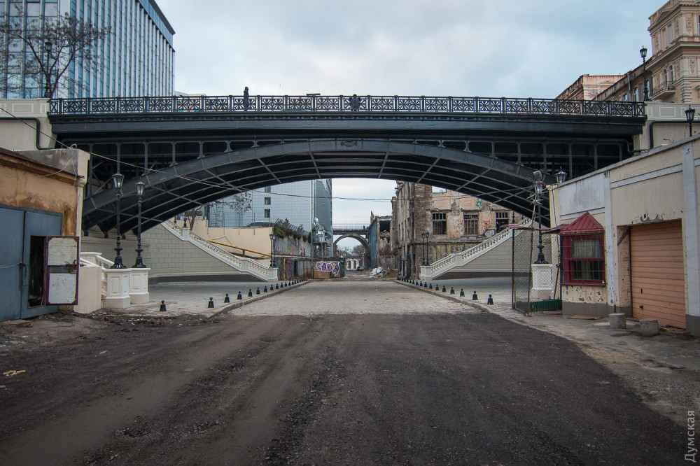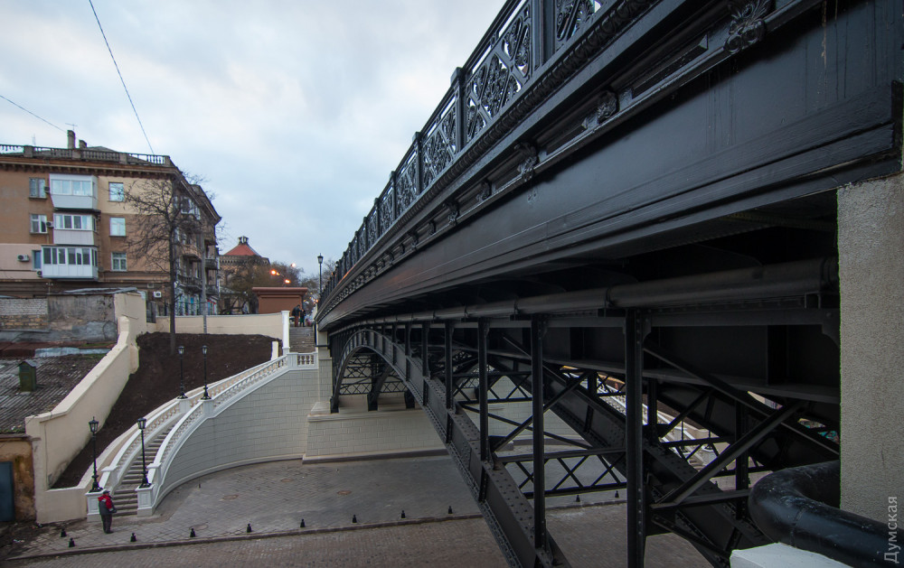 Как передает корреспондент «Думской», рабочие компании «Ростдорстрой» (либо подрядчика, который выполняет для них работы) покинули объект. Визуально мост выглядит очень хорошо и ярко контрастирует с окружающей действительностью Деволановского спуска, который одесситы окрестили «канавой».