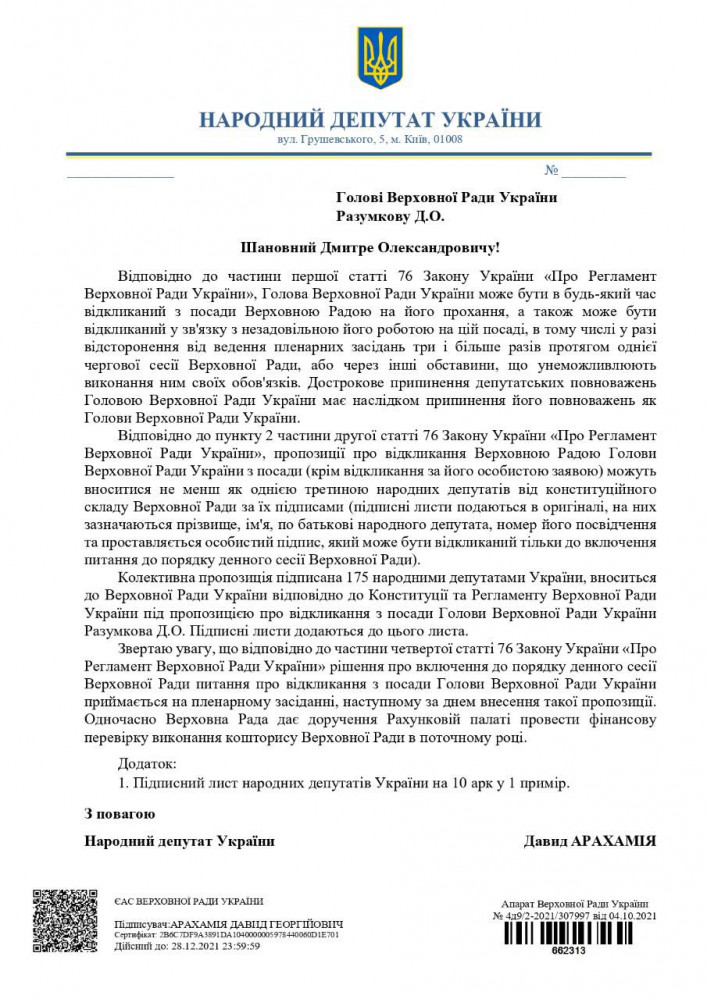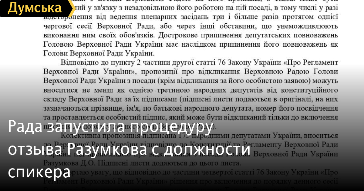 «По представлению народного депутата Давида Арахамии запускается процедура отзыва главы Верховной рады Украины с должности. Как и отмечал ранее, все будет происходить в соответствии с законом и Регламентом», — подчеркнул Разумков.