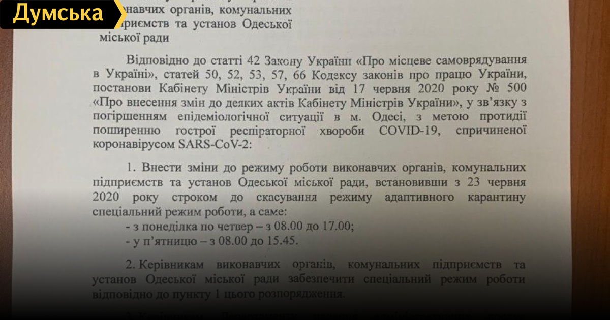 Ради борьбы с коронавирусом чиновники одесской мэрии будут приходить на работу на час раньшеОдесский городской голова Геннадий Труханов распорядился изменить график работы структурных подразделений мэрии. Как говорится в распоряжении Труханова, такие меры вводятся для борьбы с распространением коронавируса в регионе. Так, с 23 июня время работы сотрудников коммунальных предприятий и департаментов сдвигается на час – с 8:00 -17:00 с понедельника по четверг и с 8:00 – 15:45 в пятницу. Новый график будет действовать до прекращения адаптивного карантина. СМЕРТЬ РОСІЙСЬКИМ ОКУПАНТАМ! Помітили помилку? Виділяйте слова з помилкою та натискайте control-enter