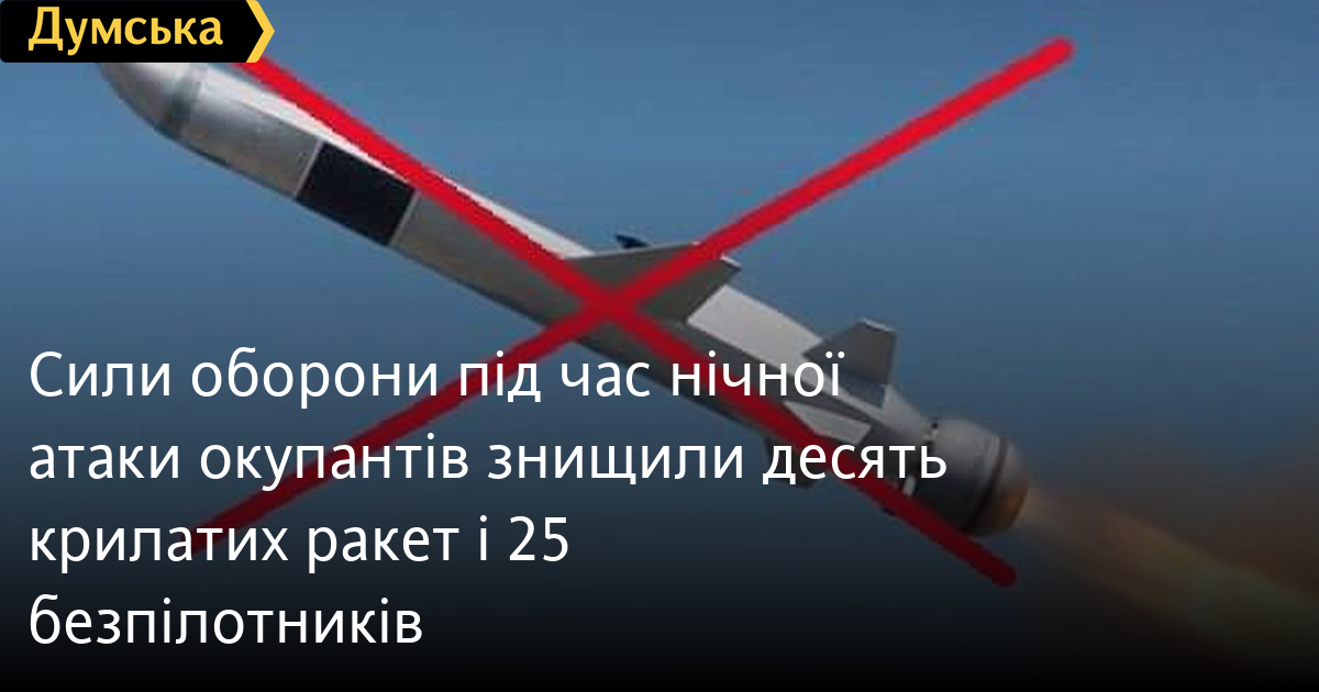 Десять ворожих ракет і 25 безпілотників знищили українські захисники під час чергової нічної атаки російських окупантів, яка тривала з 22:00 25 травня до 5:00 26 травня.