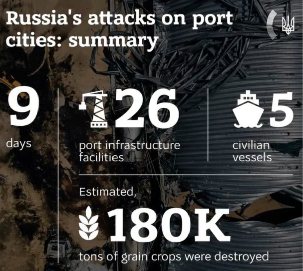 Окрім зерна, ворог знищив 26 портових об'єктів і пошкодив п'ять цивільних суден.