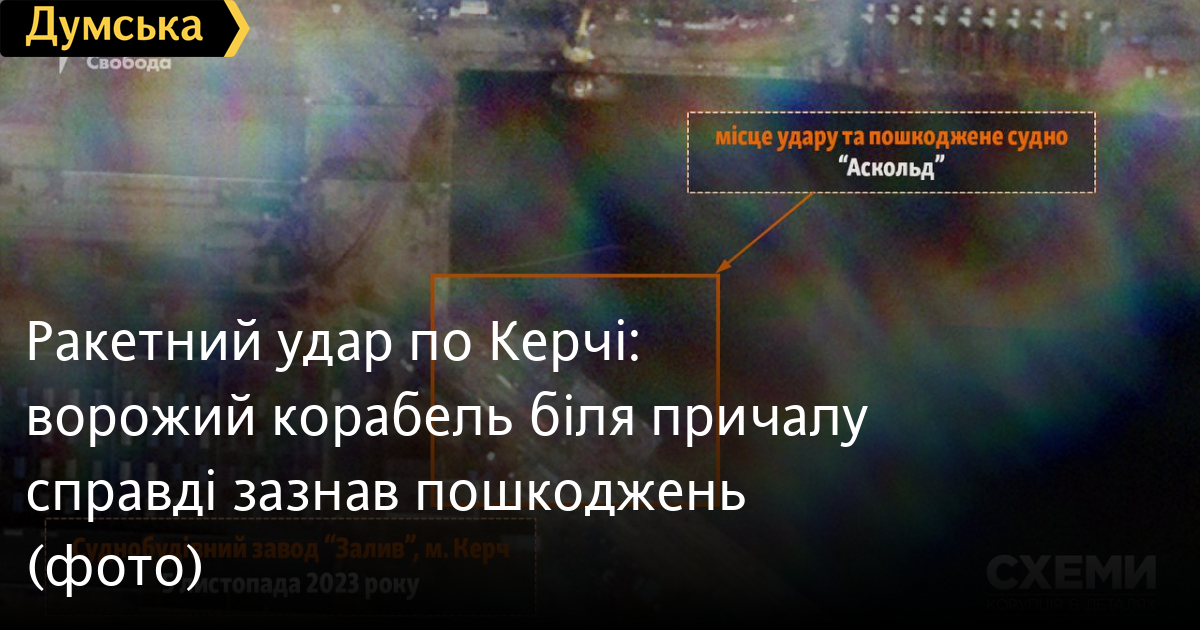 «За моїми даними на 4 листопада в Керчі на момент вибухів перебував тільки один корабель, здатний нести ракети класу «Калібр», а саме «Аскольд». Я думаю, що цей корабель, як ми бачимо, стояв уже біля причалу і його доводили до ладу, тому що вже в грудні його мали б здати. Видно, що він ще на плаву, але верхня частина судна помітно пошкоджена», — розповів «Схемам» капітан 1 рангу запасу ВМС України Андрій Риженко після аналізу супутникового знімка.