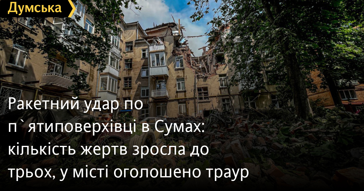 Кількість загиблих унаслідок вчорашнього удару окупантів по п'ятиповерхівці в Сумах зросла до трьох.