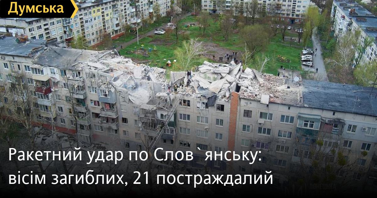 Вісім людей загинули і 21 постраждала внаслідок ракетного удару по місту Слов'янськ Донецької області.