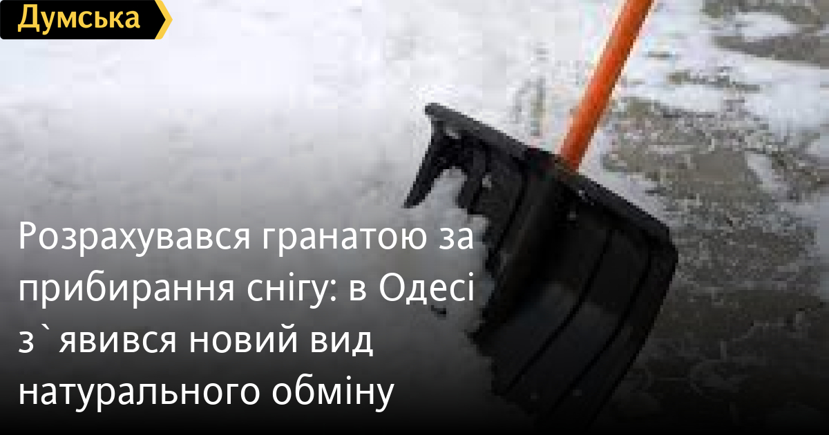 Розрахувався гранатою за прибирання снігу: в Одесі з`явився новий вид натурального обмінуГранату з додатковою осколковою сорочкою «заробив» одесит за прибирання снігу. Небезпечний предмет він у підсумку сам здав у поліцію, повідомили «Думській» правоохоронці. Корпус гранати, запал і додаткову осколкову сорочку направили на експертизу. Поліцейські проводять досудове розслідування за статтею незаконне поводження зі зброєю, бойовими припасами або вибуховими речовинами (ч.1 ст.263 Кримінального кодексу України). СМЕРТЬ РОСІЙСЬКИМ ОКУПАНТАМ! Помітили помилку? Виділяйте слова з помилкою та натискайте control-enter |