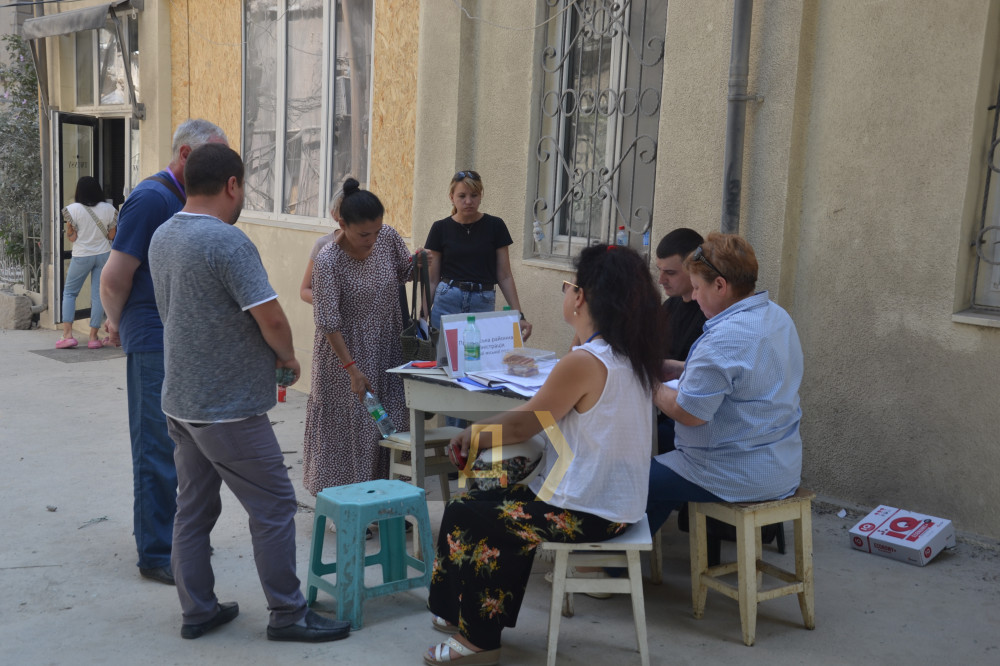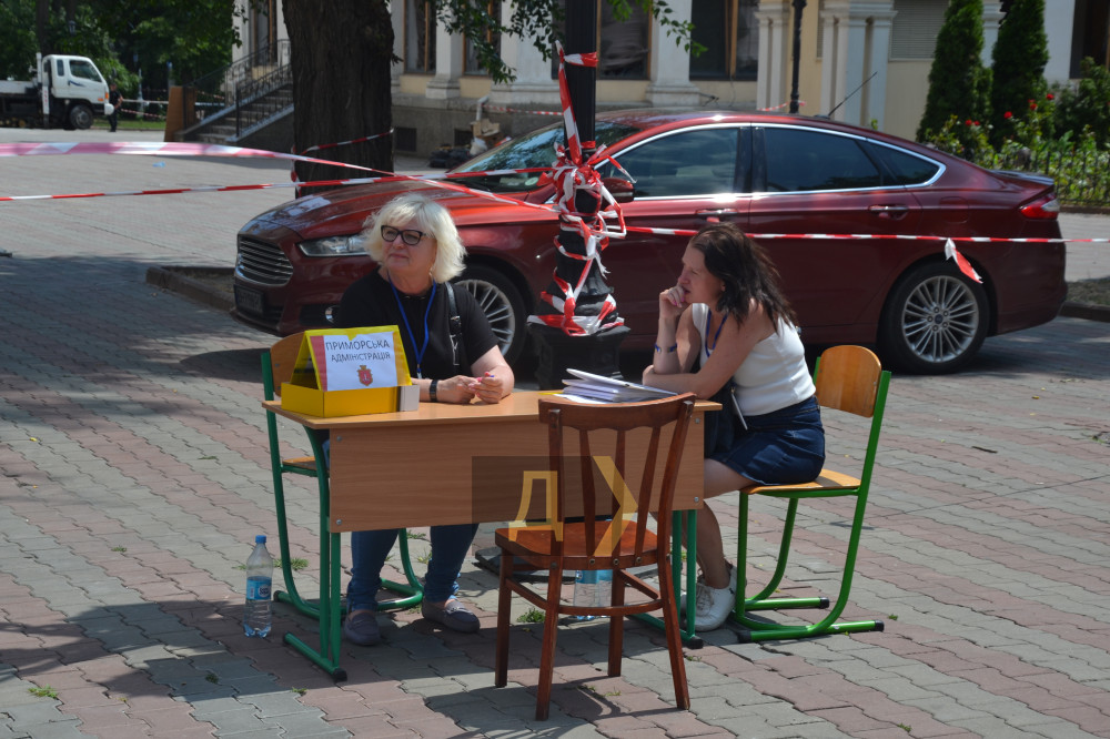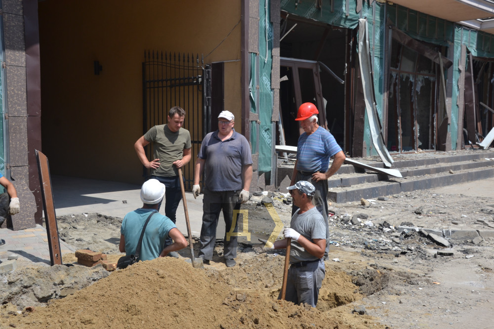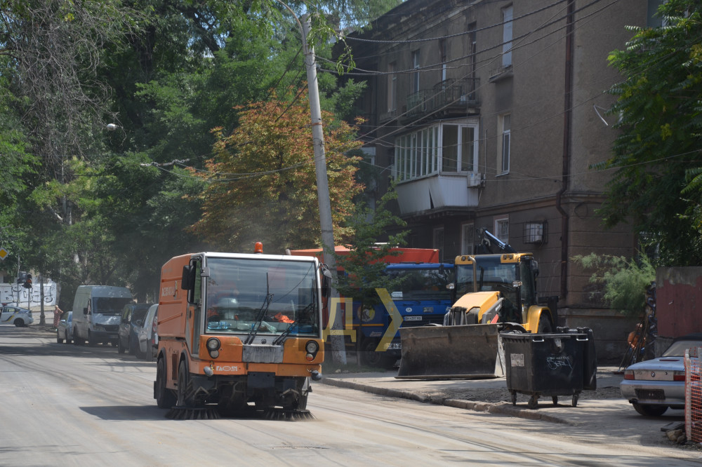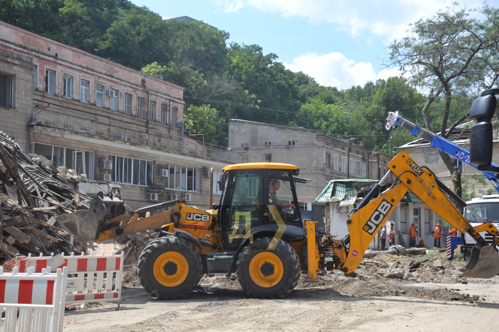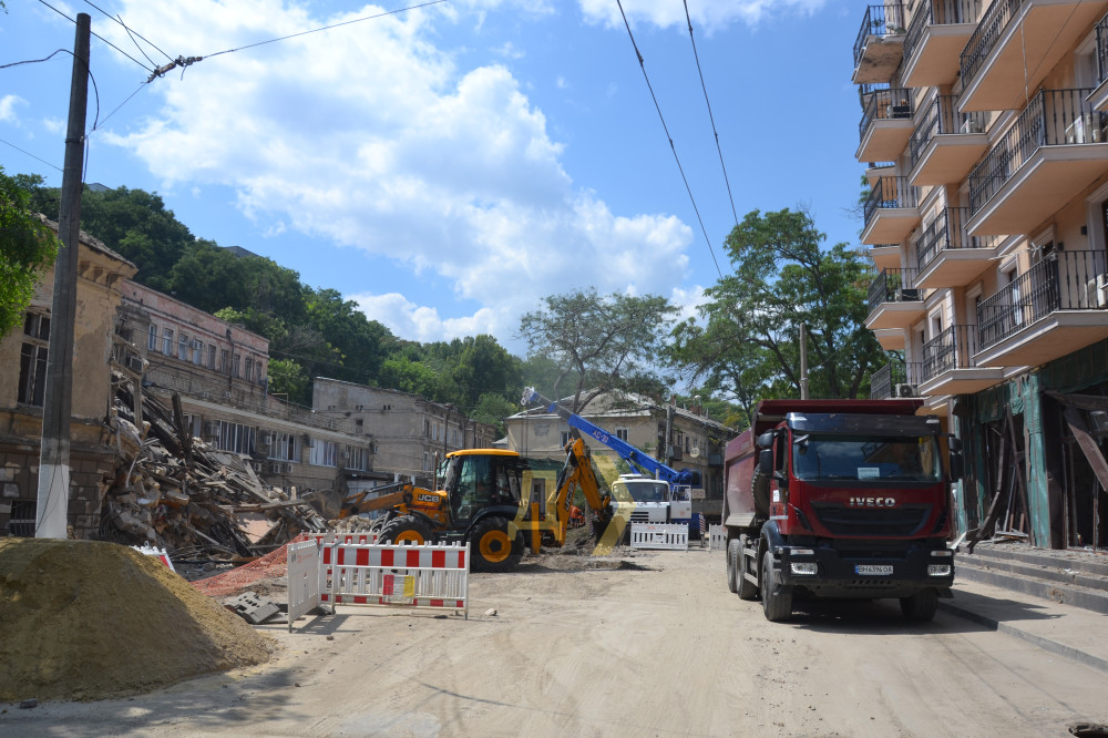 На Приморській вулиці працює важка техніка: екскаватор вантажить, самоскиди вивозять уламки. Туди-сюди їздить підмітально-прибиральний «Глобус», збираючи численний пил. Комунальники втомлені — працювати доводиться на спеці.