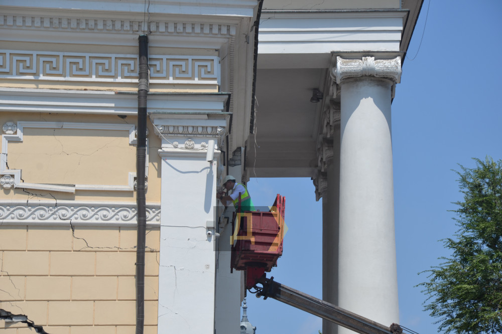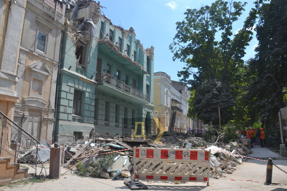 А ось на Преображенській, 4, де дуже серйозно постраждав один із корпусів будинків Соломос (побудований 1913 року), і на інших локаціях, де руйнувань зазнали пам'ятки архітектури, комунальники працюють тільки на прилеглій території.