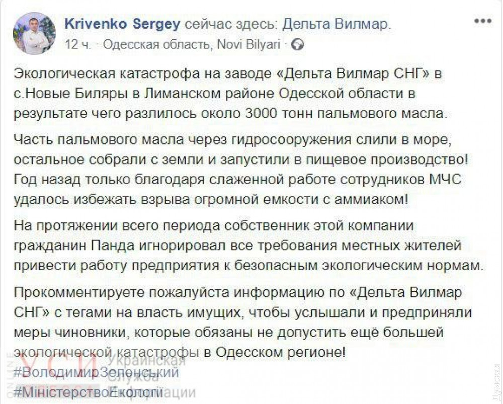 О масштабном разливе пальмового масла на заводе «Дельта Вильмар СНГ» в селе Новые Беляры под Южным 1 декабря сообщил депутат Лиманского райсовета Сергей Кривенко.