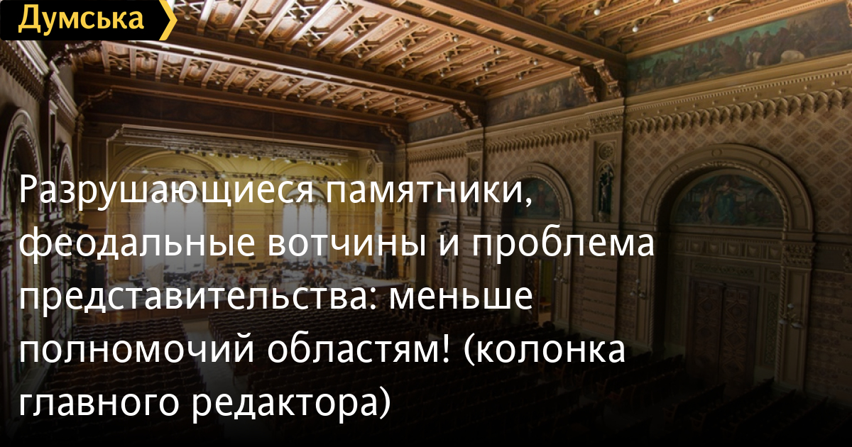 Вторая причина — дуализм областной власти: есть государственная администрация, есть областной совет с шатким большинством. Отношения между ними, мягко говоря, не самые лучшие. Депутаты не поддерживают инициативы ОГА, а чиновники – депутатские. А поскольку у разных групп разные интересы, то и инициативы выходят разные. В итоге памятники архитектуры остаются как то дитя с семью няньками.