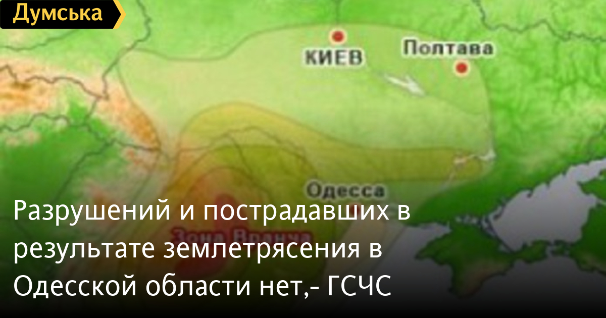 Разрушений и пострадавших в результате землетрясения в Одесской области нет,- ГСЧСЗемлетрясение с эпицентром в восточной части Румынии, которое почувствовали сегодня ночью, зафиксировали в южных районах Одесской области — в Измаиле, Рени, Болграде, а также Одессе. Как сообщили в Государственной службе по чрезвычайным ситуациям, сила толчков на территории области составила 2-3 балла по шкале Рихтера. Пострадавших людей и разрушений зданий нет. В эпицентре землетрясения сила толчков зафиксирована 6 баллов по шкале Рихтера, магнитуда 5,5 балла на глубине 95 км. Повторных толчков не зафиксировано. СМЕРТЬ РОССИЙСКИМ ОККУПАНТАМ! Заметили ошибку? Выделяйте слова с ошибкой и нажимайте control-enter |