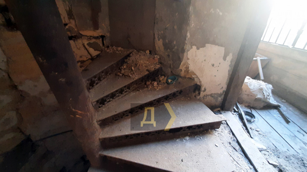 Но импровизированная гидроизоляция не очень спасает междуэтажные перекрытия верхних этажей. На 4-м и 5-м этажах опасно ходить, можно провалиться, так как местами деревянные полы попросту прогнили, но на втором и третьем сохранился даже паркет, частично сохранилась железная винтовая лестница, старинная лепнина на потолках. Правда, она то и дело отпадает.