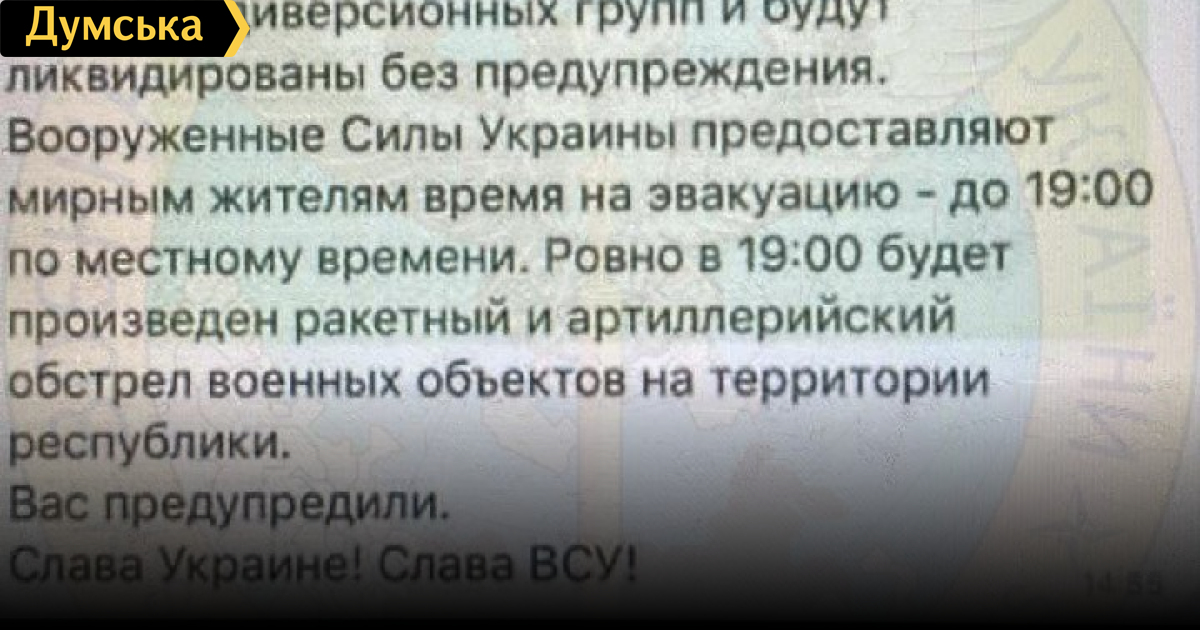 Разведка: россия готовит ракетный удар по территории Приднестровья с жертвами и хочет обвинить в этом УкраинуЖители непризнанного Приднестровья получают sms от имени Вооруженных сил и спецслужб Украины. Они содержат предупреждение о «ракетном и артиллерийском» ударе по территории «ПМР». Об этом сообщает Главное управление разведки МО Украины. «Служба безопасности Украины настоятельно рекомендует провести эвакуацию гражданского населения в более безопасные регионы. Уверяем, Вооруженные Силы Украины не желают зла мирным жителям, однако оставшиеся в городах люди будут восприняты в качестве диверсионных групп и будут ликвидированы без предупреждения. Ровно в 19:00 будут проведены ракетные и артиллерийские обстрелы объектов на территории республики», — говорится в сообщениях. Разведка также отмечает, что рассылку фейковых сообщений активно освещают пропагандистские информационные ресурсы рф. СМЕРТЬ РОСІЙСЬКИМ ОКУПАНТАМ! Помітили помилку? Виділяйте слова з помилкою та натискайте control-enter |