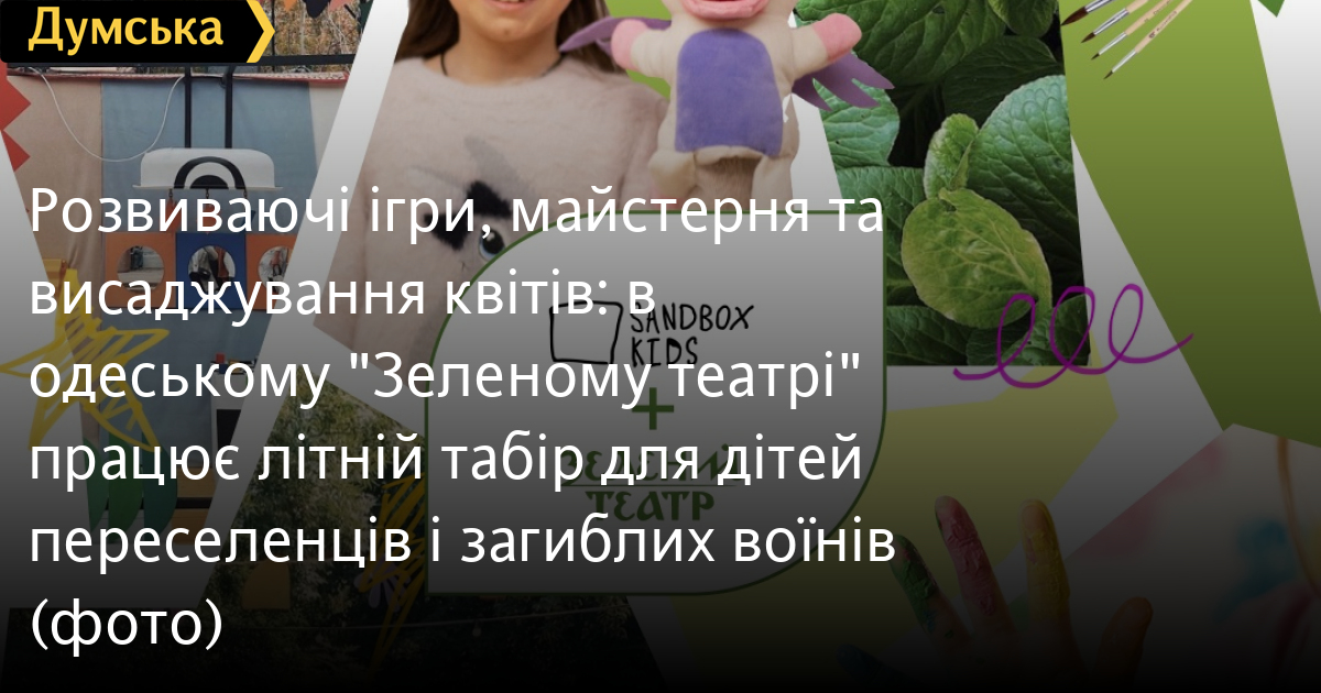 Розвиваючі ігри, майстерня та висаджування квітів: в одеському «Зеленому театрі» працює літній табір для дітей переселенців і загиблих воїнівРозвивальний простір Sandbox Kids з 1 червня працює в одеському «Зеленому театрі». Організатори проєкту повідомили, що безкоштовно забезпечують дозвілля для дітей переселенців, волонтерів і загиблих на фронті військовослужбовців. Простір працює щодня з 10 до 18 години для дітей віком від п'яти до 12 років. Батьки можуть залишити свою дитину на чотири години, попередньо пройшовши реєстрацію. Для дітей передбачено п'ять зон: будиночок для ігор, у якому відбуваються квести, ігри для розвитку моторики, творча майстерня, де проводять майстер-класи, зелена зона, де діти грають у футбол, волейбол, бадмінтон та інші активні ігри, тераса, де дітей навчають висаджувати квіти та овочі, а також сцена, де маленьких відвідувачів навчають риторики, акторської майстерності, сучасних танців. Помітили помилку? Виділяйте слова з помилкою та натискайте control-enter |
