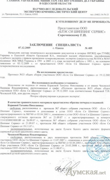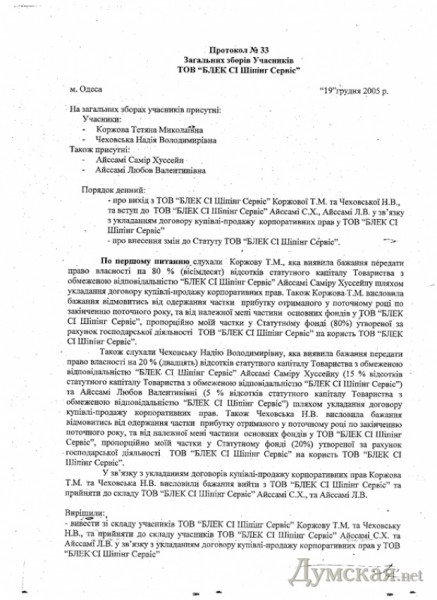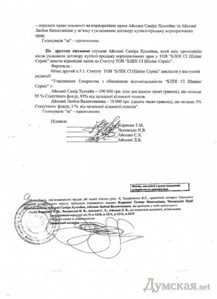 История же захвата ООО «Блек Си Шипинг Сервис», развивалась следующим образом. По словам представителей Валентина Коржова, в 2005 году зять Валентина Айссами Самр Хуссейн на основании поддельного протокола решения собрания учредителей зарегистрировал на себя 95% доли в уставном капитале предприятия.