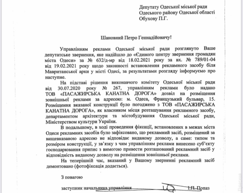 «Украшение» Мавританской арки на Французском бульваре Одессы в виде рекламного щита сняли временно, чтобы привести в соответствие с выданным ранее разрешением.