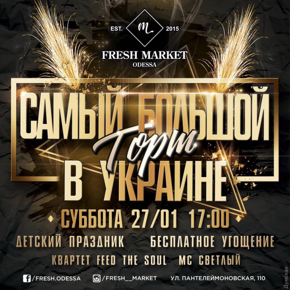 27 января на территории рынка Fresh Market, расположенного на Пантелеймоновской, 110, будет зафиксирован украинский рекорд 2018 года — «Самый большой торт». Мероприятие будет интересно и взрослым, и детям. Рекорд на самый большой торт Украины поставят местные пекари-кондитеры. После регистрации рекорда все желающие смогут попробовать торт и принять участие в развлекательной программе. Кроме того, в программе мероприятия — концерт группы Feed the Soul. Начало концерта в 18:00. Ведущий вечера — МС Светлый. Отметим, Fresh Market открыт с ноября прошлого года. Это уникальный рынок еды в Одессе, который объединил в себе все то, что так любят одесситы — рестораны более чем 20-и кухонь мира, шоурумы известных дизайнеров и фуд-корты на любой вкус. Также на территории маркета действует развлекательная зона с большой сценой, где ежедневно проходят всевозможные конкурсы, фестивали и музыкальные концерты. Fresh Market— это территория, где можно отдохнуть, приятно провести время за покупками или вкусным ужином и зарядиться хорошим настроением. Адрес: ул. Пантелеймоновская, 110 Мероприятие состоится 27 января. С 17:00 — развлекательное шоу для детей и взрослых с участием аниматоров. Вход свободный. СМЕРТЬ РОСІЙСЬКИМ ОКУПАНТАМ! Помітили помилку? Виділяйте слова з помилкою та натискайте control-enter |