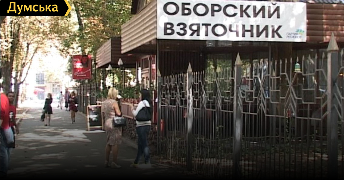 «Мы писали в прокуратуру и МВД жалобы на Оборского, но реакции нет. Поэтому решили действовать своими способами и вчера вечером вывесили плакат, — говорит бизнесмен. — Наше заведение не зря называется именем революционера. Так что, идти на поводу у коррупционеров мы не имеем права. А еще хотим обратиться к мэру города, чтобы он выделил Оборскому пару гектаров земли для теневого бизнеса, а то ему уже очень тесно на проспекте Шевченко».