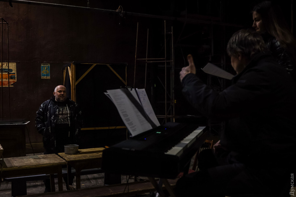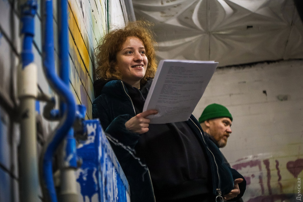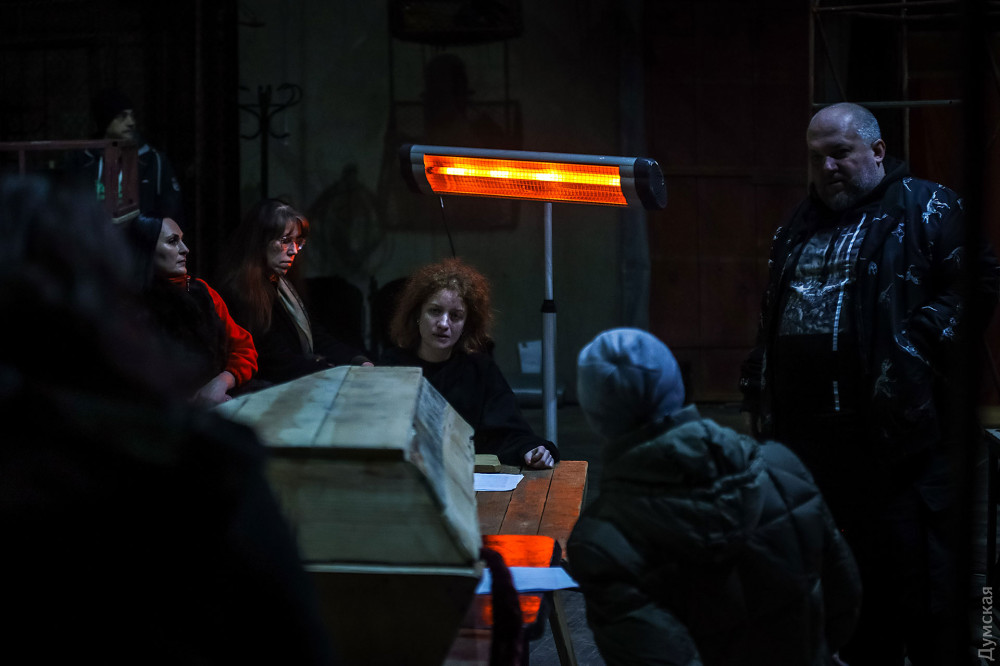 Репетицию прерывает вой сирен, и актеры покидают селедку, гроб (другого реквизита пока нет), перемещаясь в бомбоубежище в театральном подвале. Собственно, премьеру планируется провести в одном из подвальных залов, прямо под сценой, даже в случае воздушной тревоги прерывать показ не придется. Играли уже на этой площадке на прошлом Литературном фестивале, публике понравилась локация. А в перспективе спектакль станет мобильным, его можно будет показать там, где он будет больше всего нужен, вне стен театра.