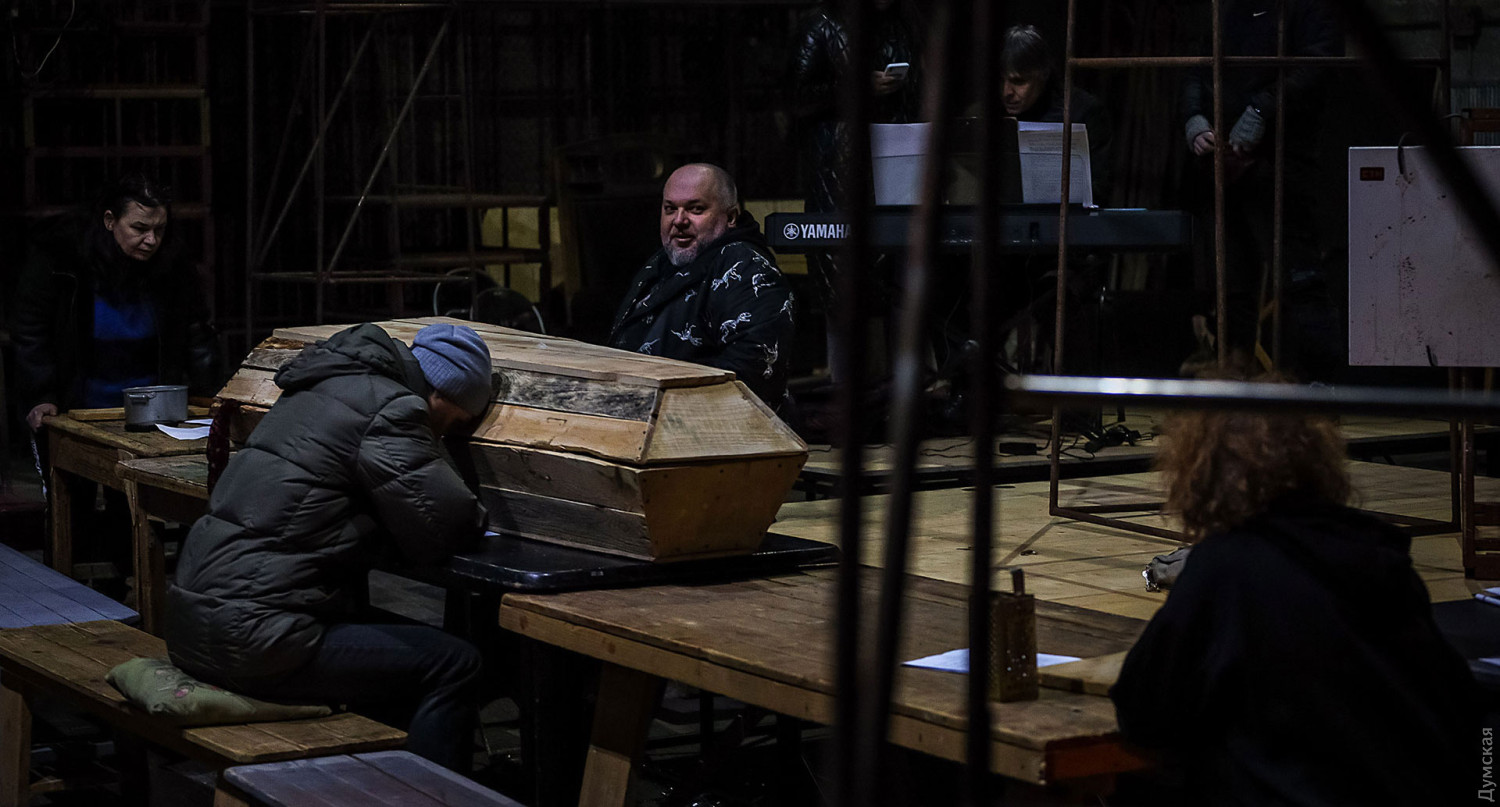Ваша любимая «Думская» вместе с артистами пряталась в бомбоубежище (это когда завыли сирены, а так-то репетируют на сцене, где уже стоит гроб для главного героя, покинувшего этот мир еще до описываемых событий).