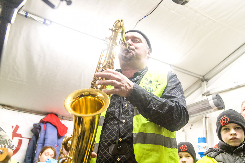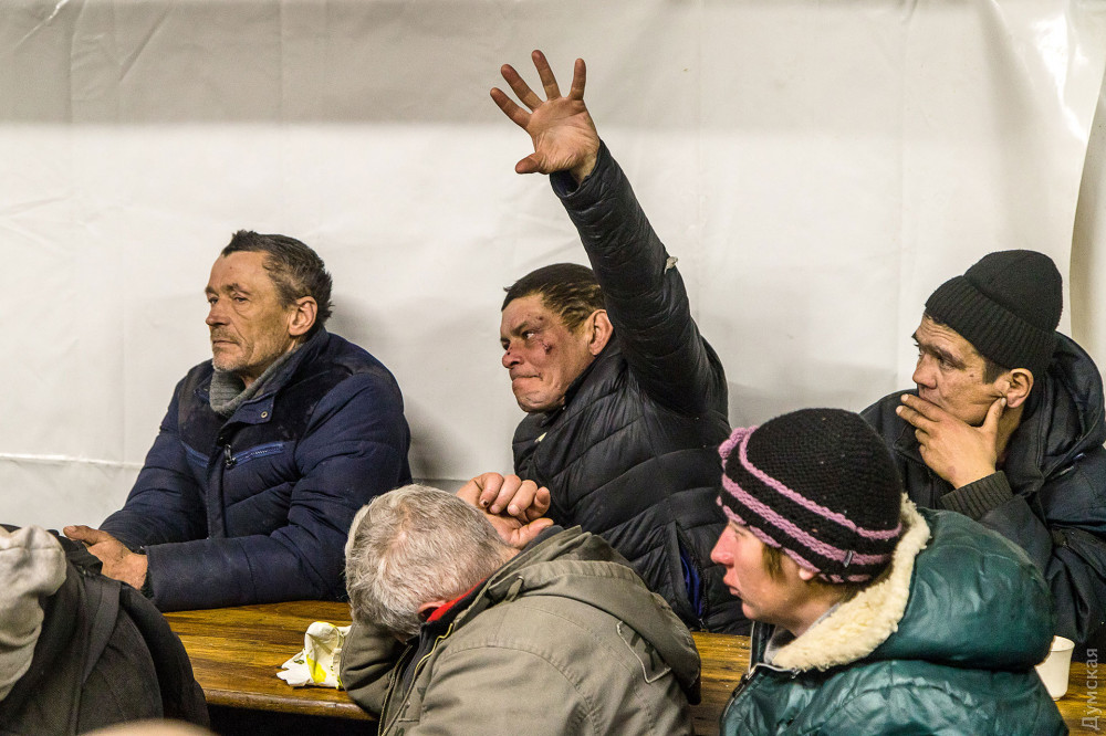 Перед входом — машина скорой и еще несколько автомобилей. Из палатки выходит мальчуган лет двенадцати в зеленой жилетке с надписью «Служба помощи бездомным людям». Узнав, что я журналист и пришел на концерт, с радостью пропускает внутрь. Бездомные сидят плотными рядами вдоль трех столов. Их здесь почти 180 человек. В воздухе висит тяжелый запах перегара и немытых тел. Сразу же в голову приходит мысль, что в их суммарном выдохе вряд ли выживет даже китайский коронавирус. Впрочем, палочки Коха наверняка куда как более живучи