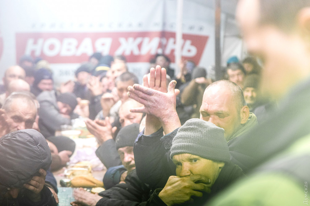 После концерта наступает то, ради чего сюда пришло большинство, — горячий ужин. Перед приемом пищи — общая молитва. Бездомные не ропщут. Кто искренне, кто нет, но все отсылают во вселенную просьбы о спасении.