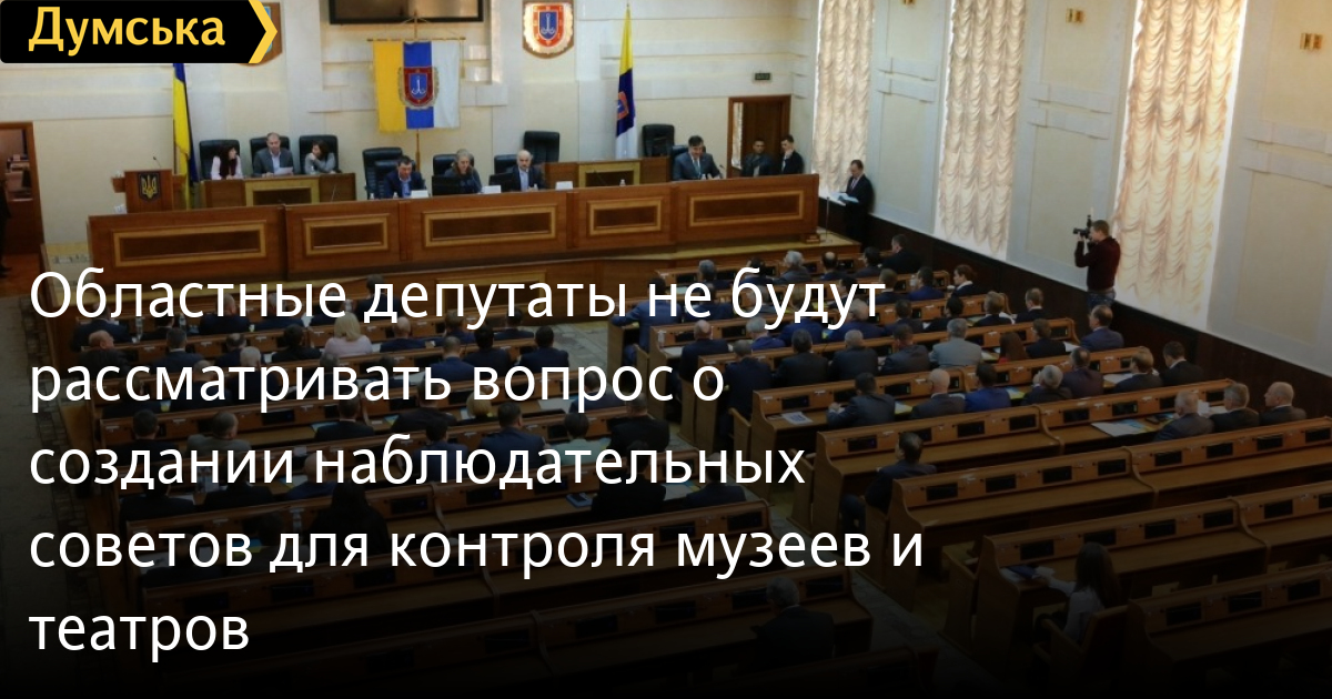 Областные депутаты не будут рассматривать вопрос о создании наблюдательных советов для контроля музеев и театровОдесский облсовет не будет рассматривать скандальный проект о создании наблюдательных советов, которые должны были контролировать каждый чих учреждений культуры. Такое решение было принято на сегодняшнем заседании глав фракций облсовета. Снять вопрос с рассмотрения предложили представители «Европейской Солидарности». Напомним, инициатива создать наблюдательные советы при каждом учреждении культуры региона, которое подчиняется собранию, принадлежит депутатам от «Оппоблока». Таким образом они хотели насолить директору Художественного музея Александру Ройтбурд. Согласно проекту, в состав набсоветов должны были войти депутаты облсовета и чиновники. Авторы предлагают предоставить им полномочия по согласованию всех трат музеев и театров, проведению любых мероприятий, утверждению перечня лиц, которые имеют доступ к хранилищам и т.д. СМЕРТЬ РОССИЙСКИМ ОККУПАНТАМ! Заметили ошибку? Выделяйте слова с ошибкой и нажимайте control-enter
