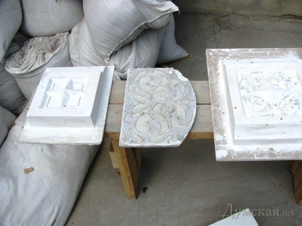 Параллельно ведутся работы по штукатурке и грунтовке ордеров, карнизов, розеток, поясков, свода арки, восстанавливается кирпичная кладка.