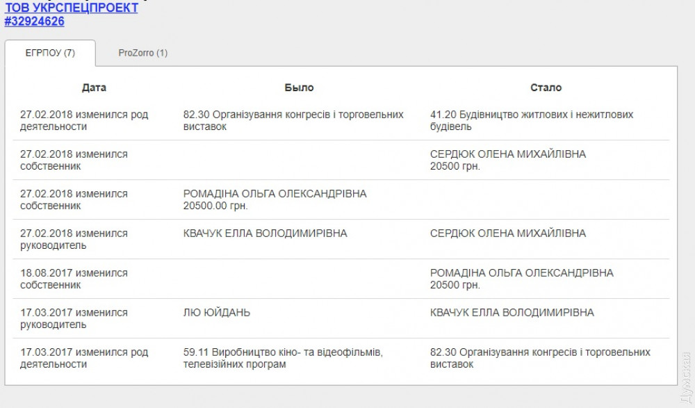 Между тем, до 27 февраля 2018 года в графе «виды деятельности» у «Укрспецпроекта» значилась «организация конгрессов и торговых выставок», а собственником была Ольга Ромадина. До 17 марта 2017 года в качестве деятельности фигурировало «производство кино- и видеофильмов, телевизионных программ», а бенефициаром был китайский предприниматель Лю Юйдань.